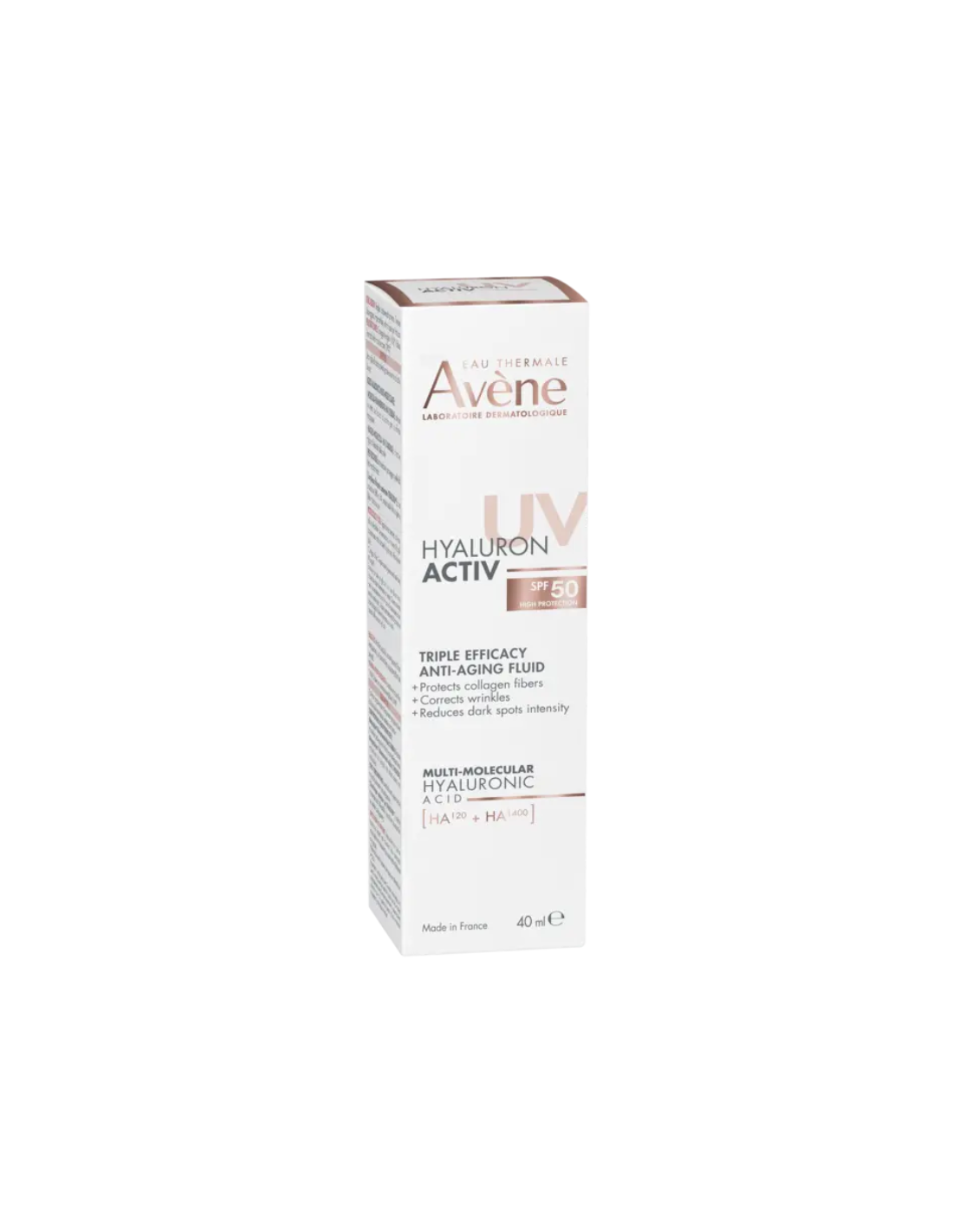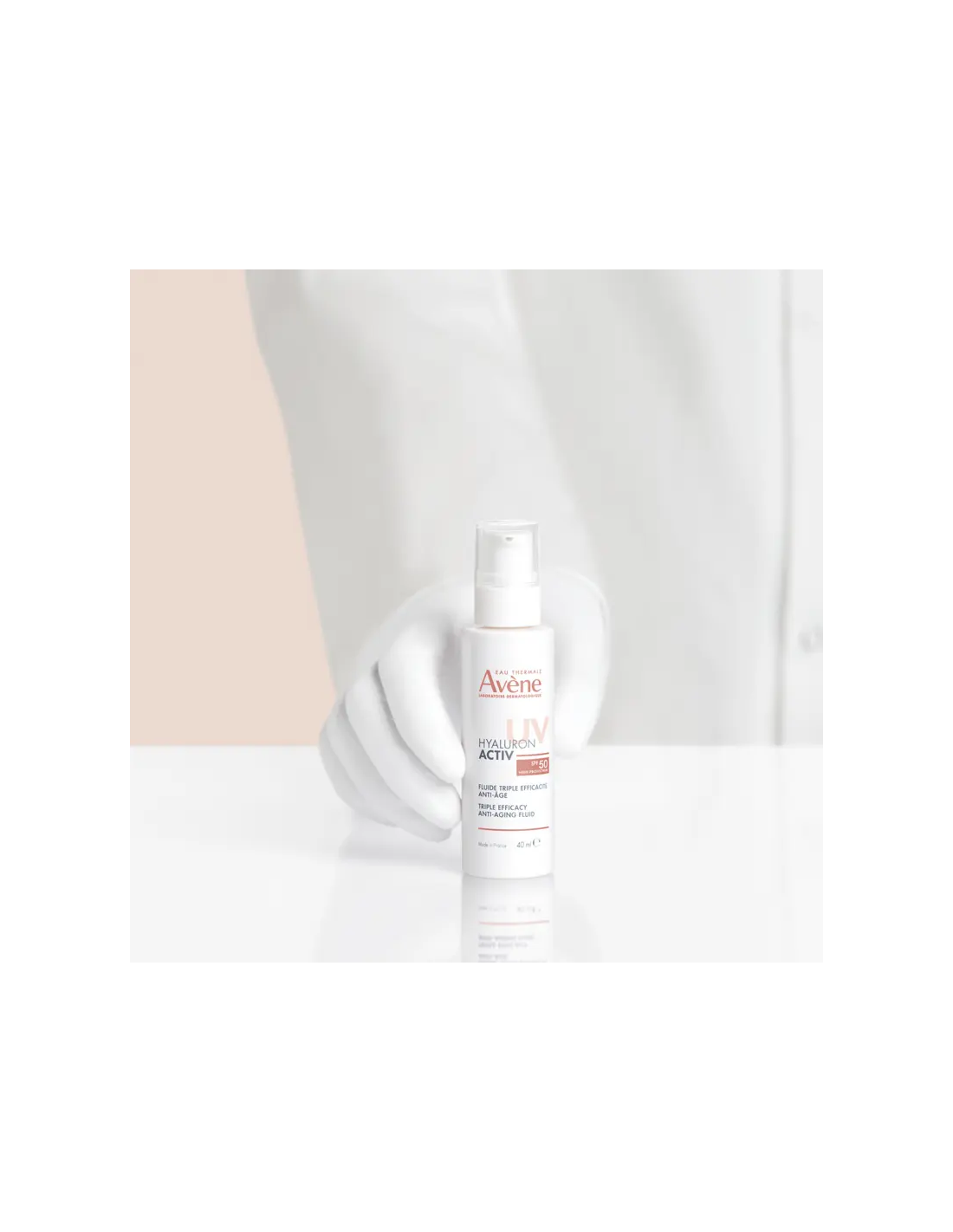 AVÈNE Hyaluron Activ UV SPF50 Fluido Triple Eficacia Antiedad es un fotoprotector facial de alta protección especialmente diseñado para pieles sensibles que buscan prevenir y corregir los signos del envejecimiento. Su innovadora fórmula protege frente a los rayos UVA, UVB y la luz azul, principales responsables del fotoenvejecimiento, gracias a su tecnología de amplio espectro. Además, actúa sobre arrugas y firmeza, aportando hidratación y mejorando visiblemente la calidad de la piel. Su textura fluida, ligera e invisible lo convierte en una excelente base de maquillaje, proporcionando confort diario sin efecto graso.