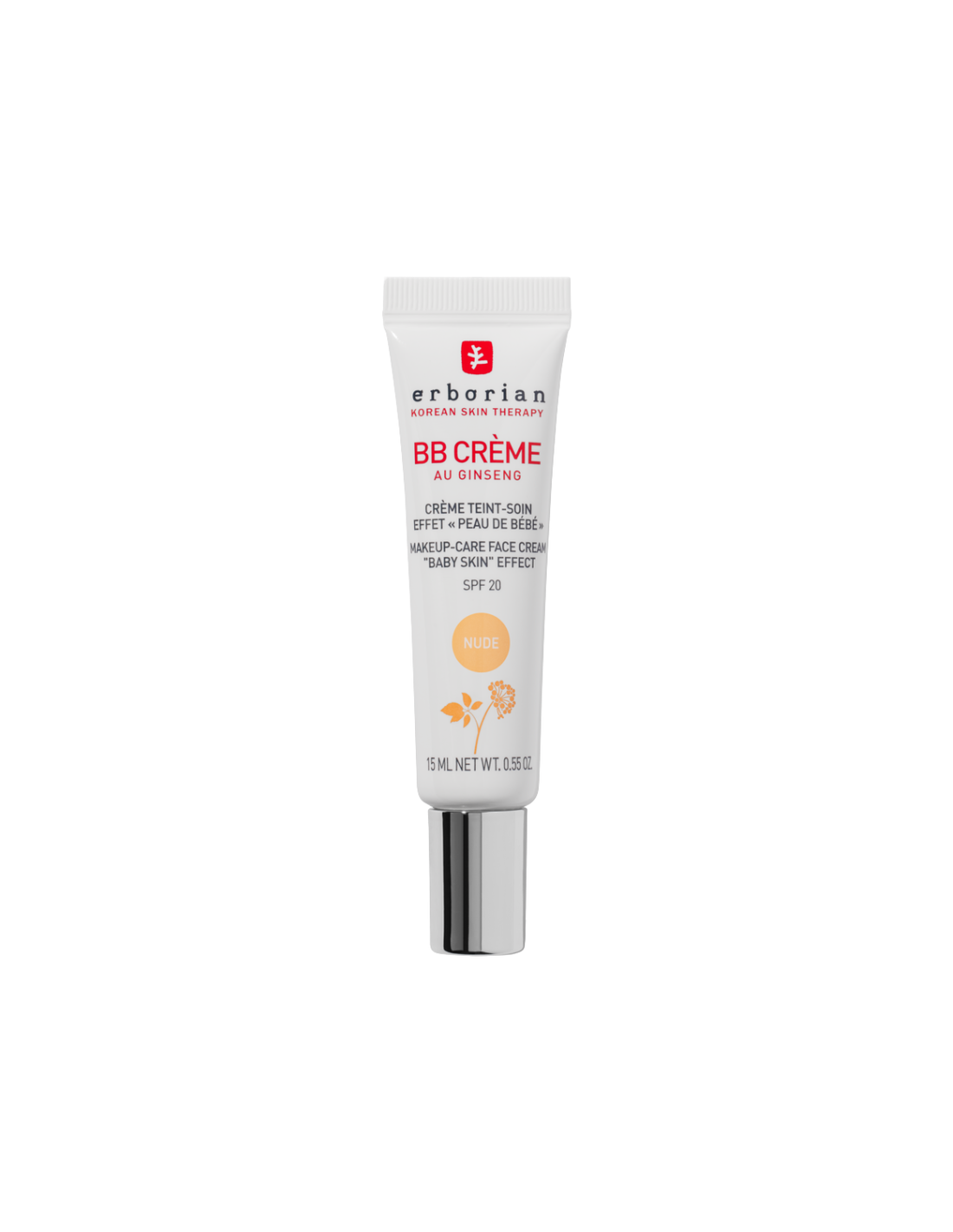 ERBORIAN Super BB Au Ginseng SPF 20 Nude es una crema de tratamiento con color que fusiona maquillaje y skincare para un efecto "piel de bebé" natural, unificando el tono, disimulando imperfecciones, mejorando la textura, hidratando y dejando un acabado aterciopelado no graso. Enriquecida con extracto de Ginseng Blanco (6 años) y un complejo botánico de regaliz, ñame silvestre, cola de caballo y kigelia, ofrece protección SPF 20 contra rayos UV, pigmentos 100% minerales y fórmula vegana, no comedogénica. Ideal para pieles normales a mixtas en tono Nude. El 100% de las usuarias notan la cobertura de las imperfecciones, piel respirando y más suave tras 1 mes. Perfecta para rutinas matutinas que buscan luminosidad, elasticidad y protección diaria.