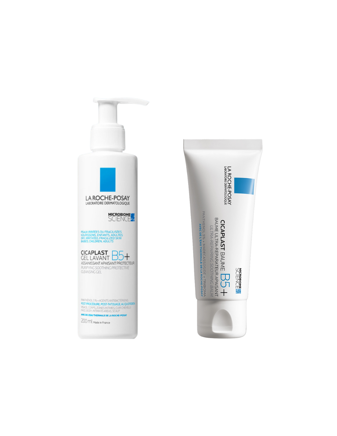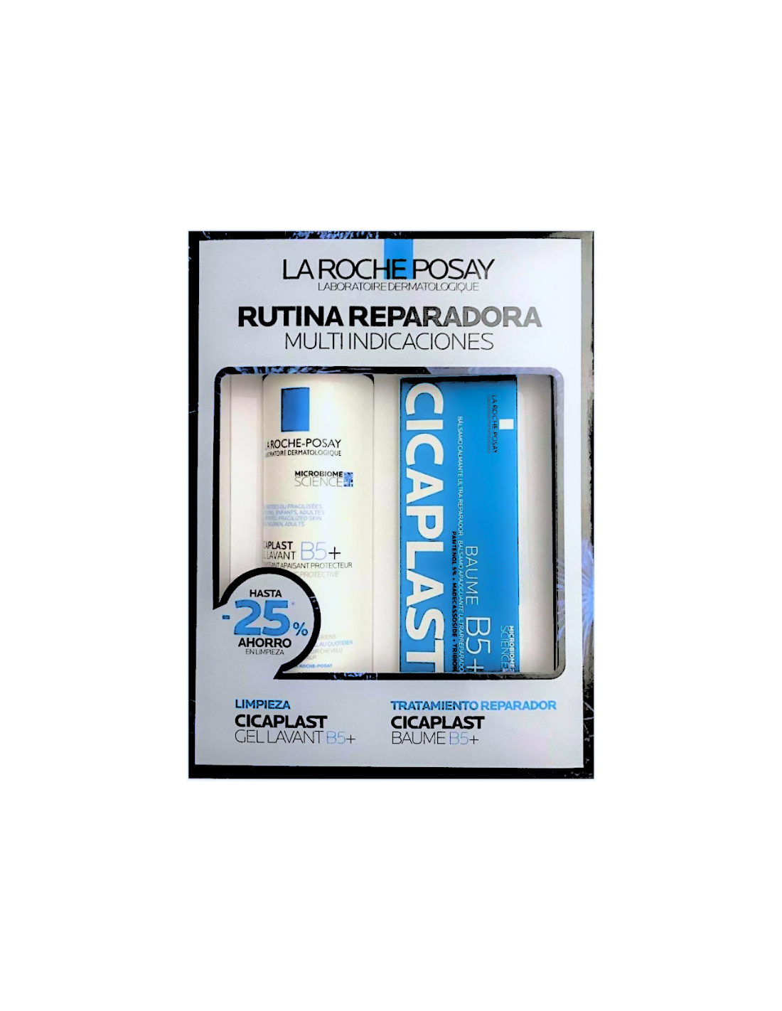 LA ROCHE-POSAY Pack Rutina Reparadora Multiindicaciones combina dos productos dermatológicos de la gama Cicaplast B5 para ofrecer una rutina de cuidado calmante, reparadora y protectora de la piel frente a distintas agresiones cutáneas leves o moderadas. El Cicaplast Lavant B5 200 ml es un gel limpiador suave sin jabón que limpia la piel con delicadeza mientras respeta su barrera natural y ayuda a aliviar la tirantez, y el Cicaplast Baume B5+ 40 ml es un bálsamo concentrado con pantenol y madecassoside que calma, repara y protege, favoreciendo la regeneración de la piel irritada o dañada. Este pack es ideal para pieles sensibles o irritadas, en cualquier zona corporal o facial que necesiten una limpieza respetuosa seguida de un tratamiento reparador eficaz.