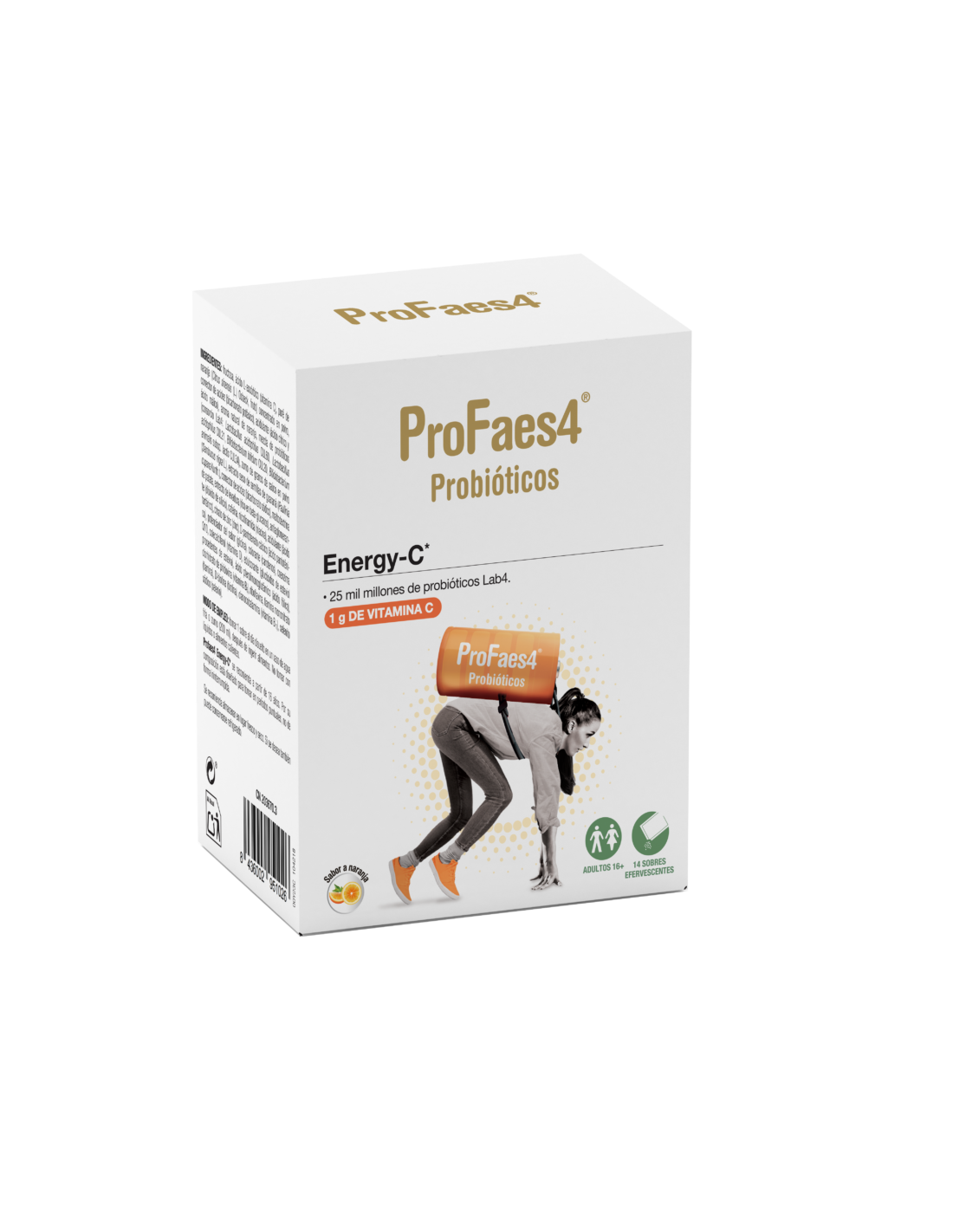 ProFaes4 Energy-C Sobres Efervescentes contiene: Lactobacillus acidophilus CUL-60, Lactobacillus acidophilus CUL-21, Bifidobacterium bifidum CUL-20, Bifidobacterium animalis subsp. lactis CUL-34, Zumo de saúco, Beta-glucanos, Extracto de guaraná, Cafeina total (del extracto de guaraná + cafeína ahidra), Coenzima Q10, Vitamina C, Vitamina D (Tamina), Vitamian B1 (Riboflavina), Vitamina B2 (Niacina), Vitamina B3 (Ácido pantoténico), Vitamina B5, Vitamina B6, Vitamina B12 (Ácido fólico), Vitamina B9 (Biotina), Vitamina B8, Zinc, Selenio.