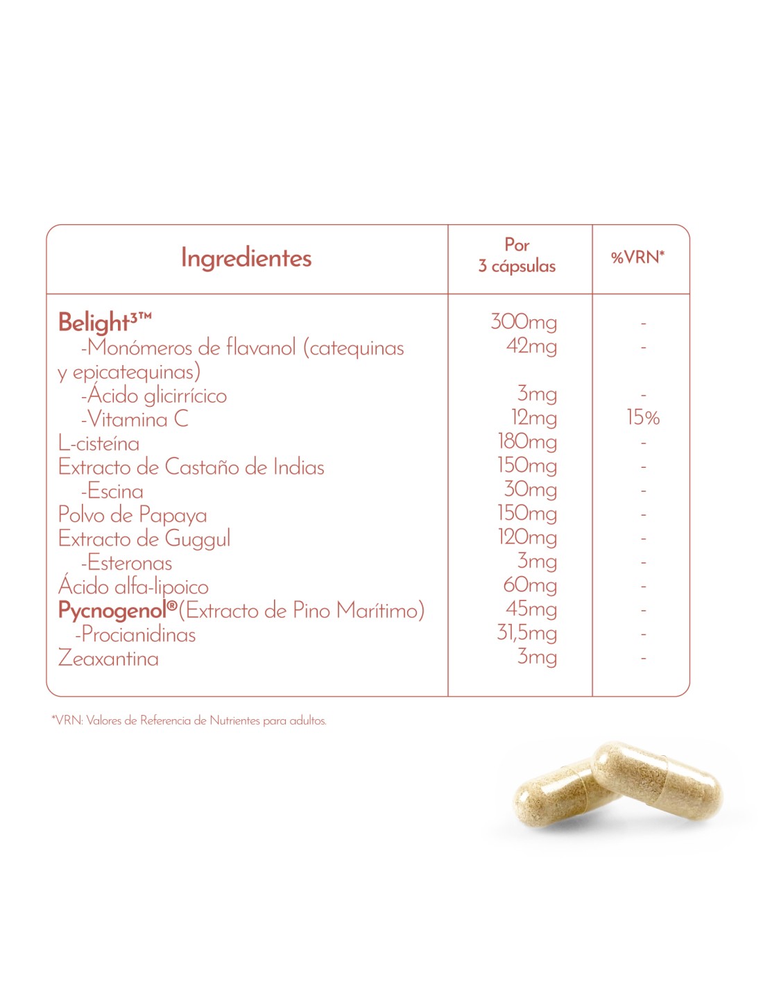Extracto de Pino marítimo Pycnogenol®, Belight³™, L-cisteína, Extracto de castaño de Indias, polvo de Papaya, HCI, Zeaxantina, Extracto de Guggul, Polvo de Papaya y ácido alfa-lipoico.