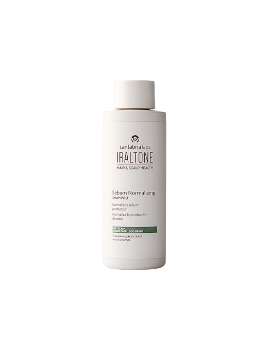 IRALTONE Champú Sebo-Regulador incluye: Matmarine algae, Vitis vinifera, Vitamina E. Esta composición asegura una limpieza suave y efectiva, regulando el exceso de sebo y dejando el cabello ligero, voluminoso y fresco, ideal para cueros cabelludos grasos.