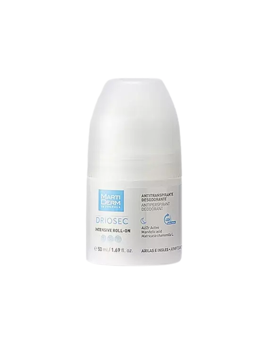 MARTIDERM Driosec Intensive Roll-On es un desodorante antitranspirante de alta eficacia especialmente indicado para el control integral de la sudoración excesiva (hiperhidrosis) en axilas e ingles. Reduce significativamente la cantidad de sudor, neutraliza el mal olor durante hasta 48 horas y mantiene la piel seca y confortable todo el día. Con acción antimicrobiana y reguladora de la humedad, respeta incluso las pieles sensibles, previene la proliferación bacteriana y ofrece protección duradera con una sola aplicación nocturna. Dermatológicamente testado, ideal para quienes buscan una solución efectiva y discreta contra la sudoración intensa.