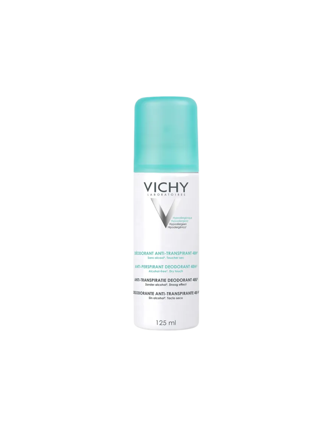 VICHY Desodorante Anti-Transpirante 48H es un desodorante en spray diseñado para ofrecer hasta 48 horas de protección eficaz contra el sudor y el olor corporal, ideal para pieles sensibles y personas con transpiración moderada a intensa. Este producto regula la sudoración, neutraliza los olores y proporciona una sensación de frescura prolongada sin dejar residuos pegajosos. Su fórmula minimiza el riesgo de irritaciones, siendo perfecta para el uso diario. Este envase es ideal para mantener la confianza y el confort en cualquier situación, desde el trabajo hasta actividades al aire libre.