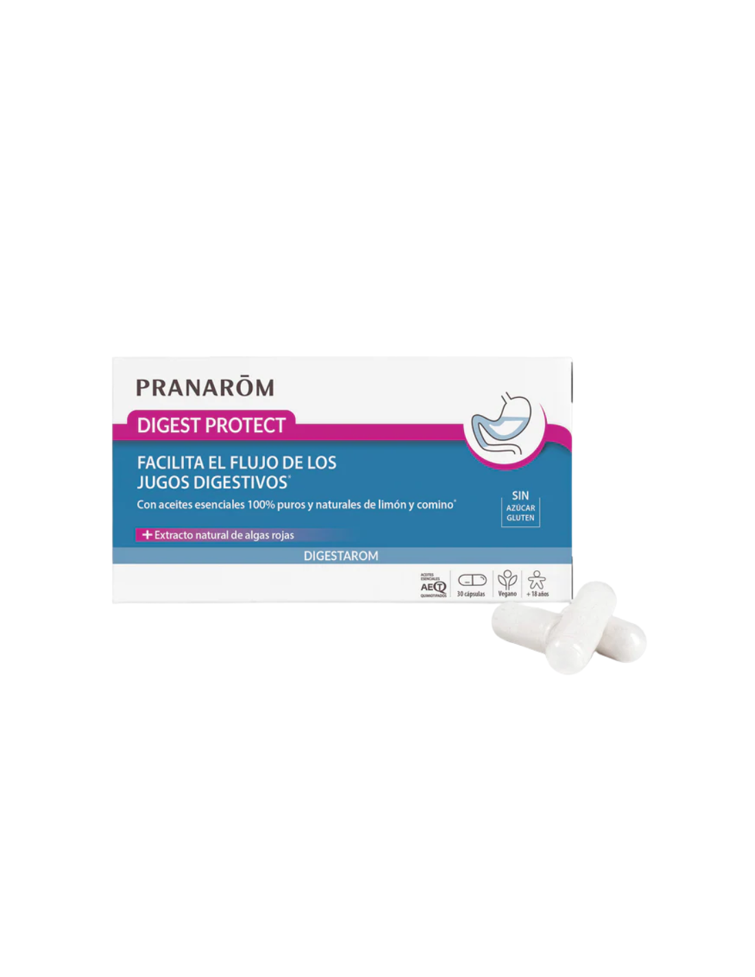 PRANAROM Digestarom Digest Protect Cápsulas es un complemento alimenticio natural formulado para favorecer el confort digestivo tras las comidas, ayudando a restablecer el equilibrio gastrointestinal y facilitando el flujo de los jugos digestivos sin provocar efectos secundarios. Combina extractos de plantas y aceites esenciales 100% puros y naturales, que contribuyen a mejorar la digestión, reducir la sensación de hinchazón y neutralizar el exceso de ácido gástrico, proporcionando alivio en caso de digestiones pesadas, molestias estomacales o lentitud tras comidas copiosas. Su fórmula sin gluten, sin azúcares y sin edulcorantes lo convierte en una opción respetuosa con las necesidades dietéticas y adecuada para quienes desean un apoyo digestivo eficaz y natural.