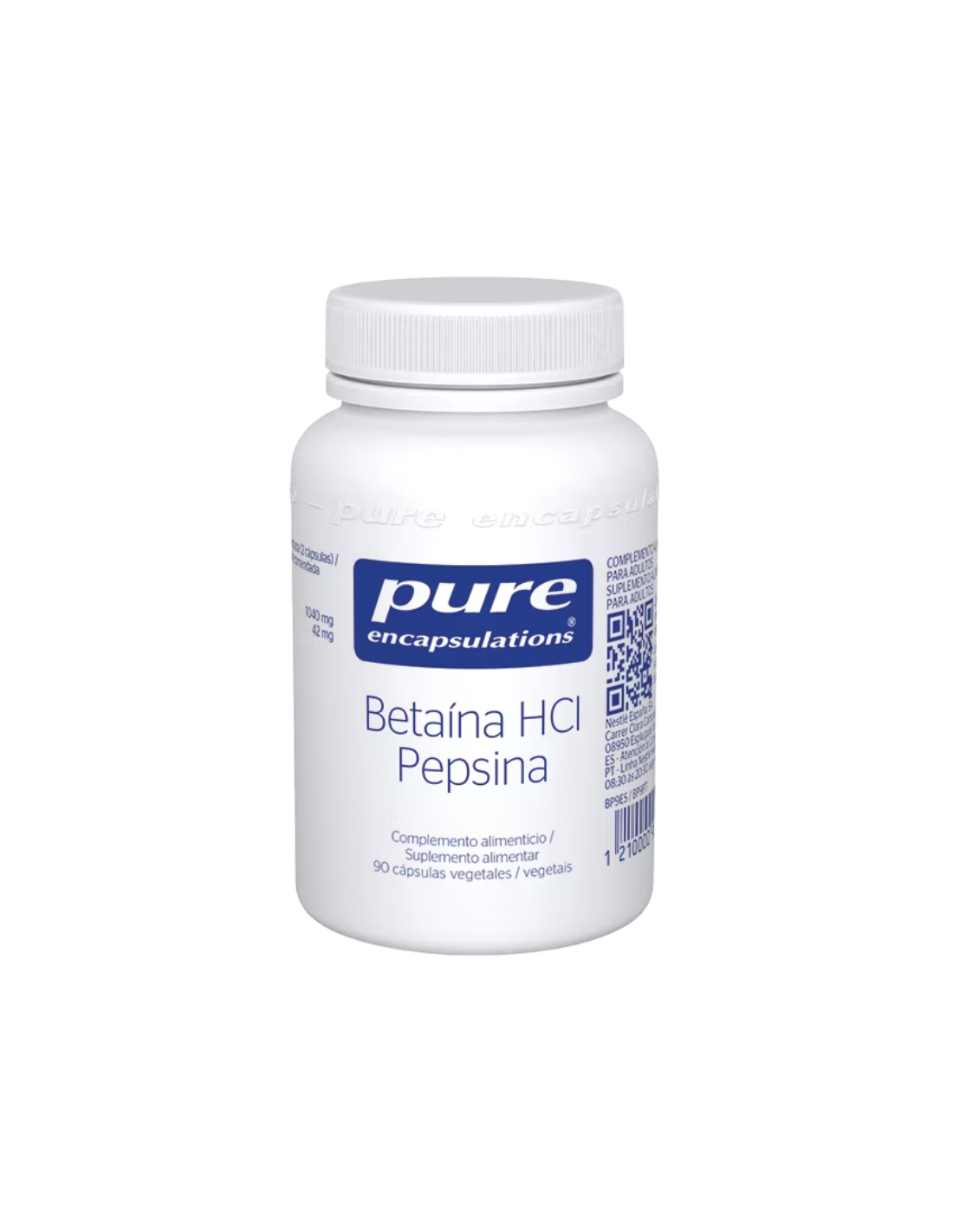 PURE ENCAPSULATIONS Betaína HCl Pepsina Cápsulas Vegetales es un complemento alimenticio premium que combina Betaína HCl (fuente de ácido clorhídrico) y pepsina pura (enzima proteolítica 1:10.000) para favorecer la descomposición de proteínas en péptidos más simples y apoyar la acidez gástrica saludable. Ideal para personas con digestión lenta o baja producción de ácido estomacal, promueve una absorción eficiente de nutrientes y un bienestar digestivo general. Este suplemento es perfecto para rutinas diarias que buscan un equilibrio gástrico sin aditivos innecesarios. Incorpora esta betaína para una digestión cómoda y efectiva, con calidad garantizada en cada dosis.