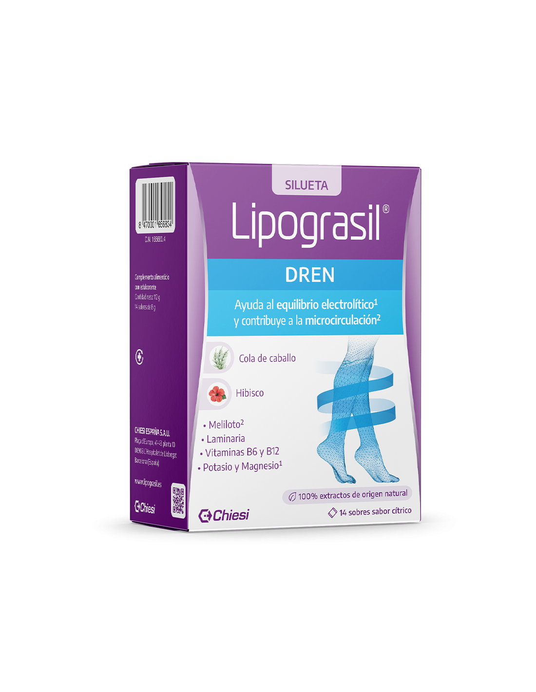 Lipograsil DREN Sabor Cítrico Sobres es un complemento alimenticio en polvo formulado para combatir la retención de líquidos, promover la detoxificación y apoyar el control de peso, ideal para adultos que buscan reducir la hinchazón y sentirse más ligeros. Con extractos naturales, este producto estimula la eliminación de líquidos, favorece la función renal y hepática, y refuerza el metabolismo, ofreciendo un efecto drenante y antioxidante. Con un refrescante sabor cítrico y bajo en calorías, es perfecto para complementar dietas hipocalóricas o planes detox. Su formato de 14 sobres proporciona un tratamiento de dos semanas, siendo una solución práctica para mejorar el bienestar y la silueta.