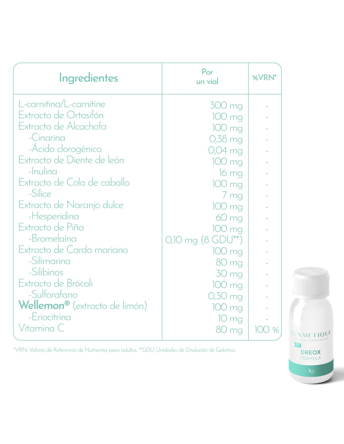 LUXMETIQUE Dreox Formula - complemento alimenticio bebible, con acciones de eficacia demostrada en favorecer el drenaje linfático, la retención de líquidos, depurativo y calmante.