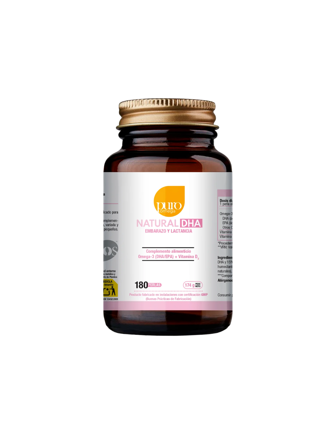 PURO Natural DHA Embarazo y Lactancia Perlas es un complemento alimenticio específicamente formulado para mujeres en etapas de embarazo y lactancia que buscan asegurar una ingesta adecuada de ácidos grasos esenciales, en especial DHA y EPA, y de vitaminas liposolubles. Este producto ayuda a aportar los nutrientes clave que pueden ser necesarios cuando la dieta no cubre por completo las elevadas demandas nutricionales propias de la gestación y la lactancia. El DHA es especialmente relevante para el desarrollo neurológico y visual del bebé, así como para mantener los niveles óptimos de estos nutrientes en la madre durante todo este periodo.