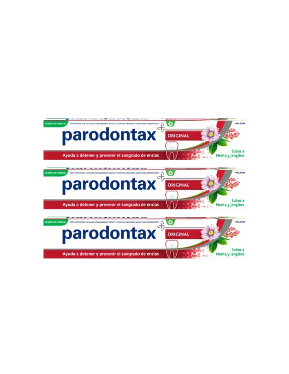 PARODONTAX Triplo Original Sabor Menta y Jengibre incluye bicarbonato de sodio, fluoruro de sodio, glicerina y aroma a menta y jengibre.