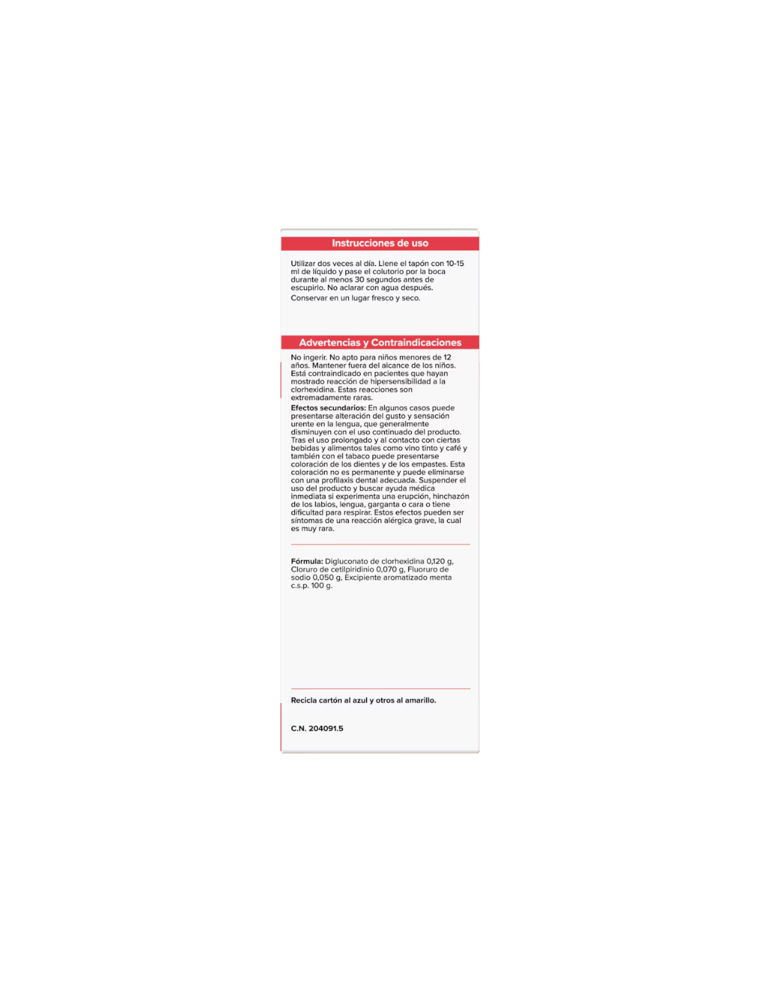Parogencyl Colutorio Forte Acción Intensiva ayuda a reducir significativamente el crecimiento bacteriano, gracias a la Clorhexidina (0,12%) y al CPC (0,07%) manteniendo sus encías sanas. También contiene Flúor (225 ppm) para fortalecer el esmalte y proteger contra las caries.