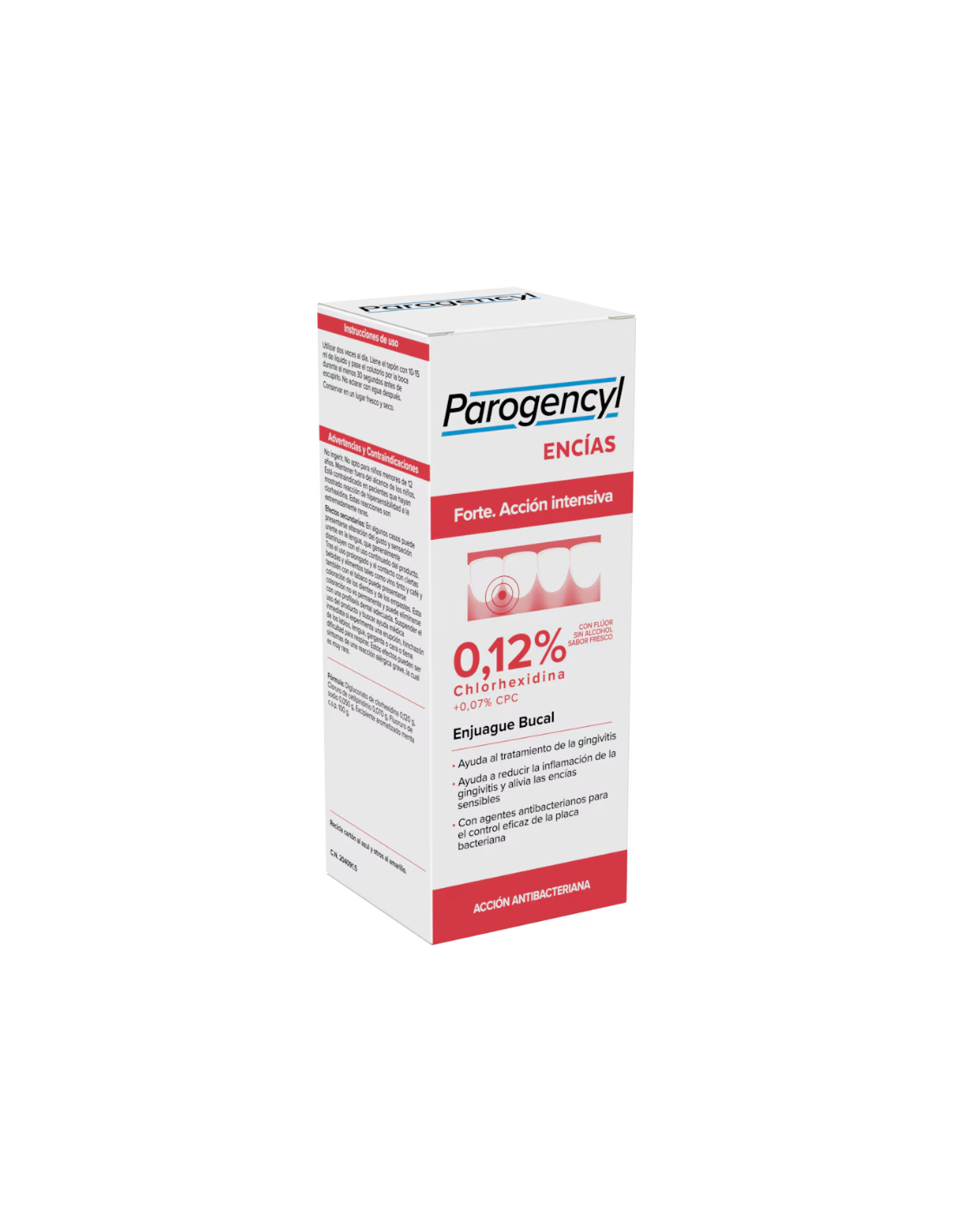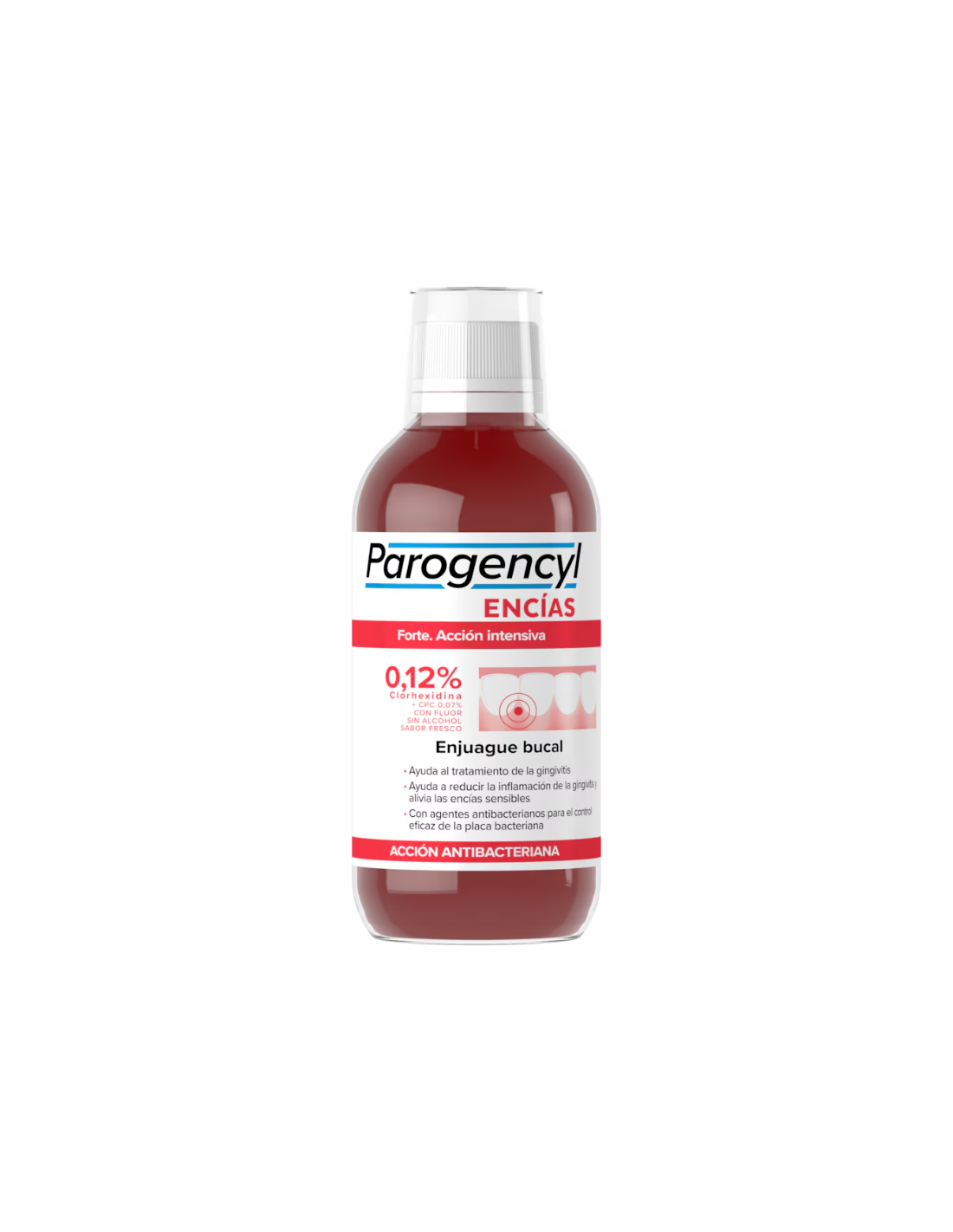 <p><strong>Parogencyl Colutorio Forte Acción Intensiva </strong>ayuda a reducir significativamente el crecimiento bacteriano, gracias a la Clorhexidina (0,12%) y al CPC (0,07%) manteniendo sus encías sanas. También contiene Flúor (225 ppm) para fortalecer el esmalte y proteger contra las caries.</p>