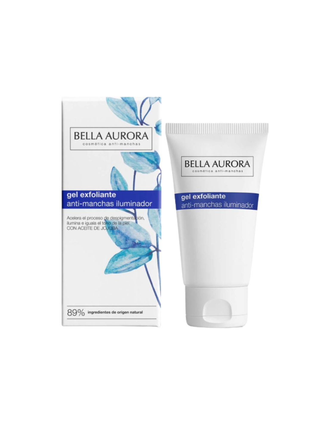 BELLA AURORA Gel Exfoliante Anti-Manchas Iluminador es un gel exfoliante de doble acción enzimática y física, ideal para todo tipo de piel, incluidas las sensibles. Estimula la renovación celular, elimina impurezas y células muertas, afina la textura, ilumina el rostro y atenúa manchas oscuras mientras previene el envejecimiento prematuro. Con 89% de ingredientes de origen natural según ISO 16128, sus perlas biodegradables de jojoba y enzimas biotecnológicas purifican en profundidad sin agredir la barrera cutánea, mejorando la absorción de tratamientos posteriores. Deja la piel suave, radiante y uniforme, con resultados clínicos probados. Textura sedosa con perlas turquesa y fragancia fresca de pera y piña, perfecto para rutinas antimanchas y antiedad eco-conscientes.