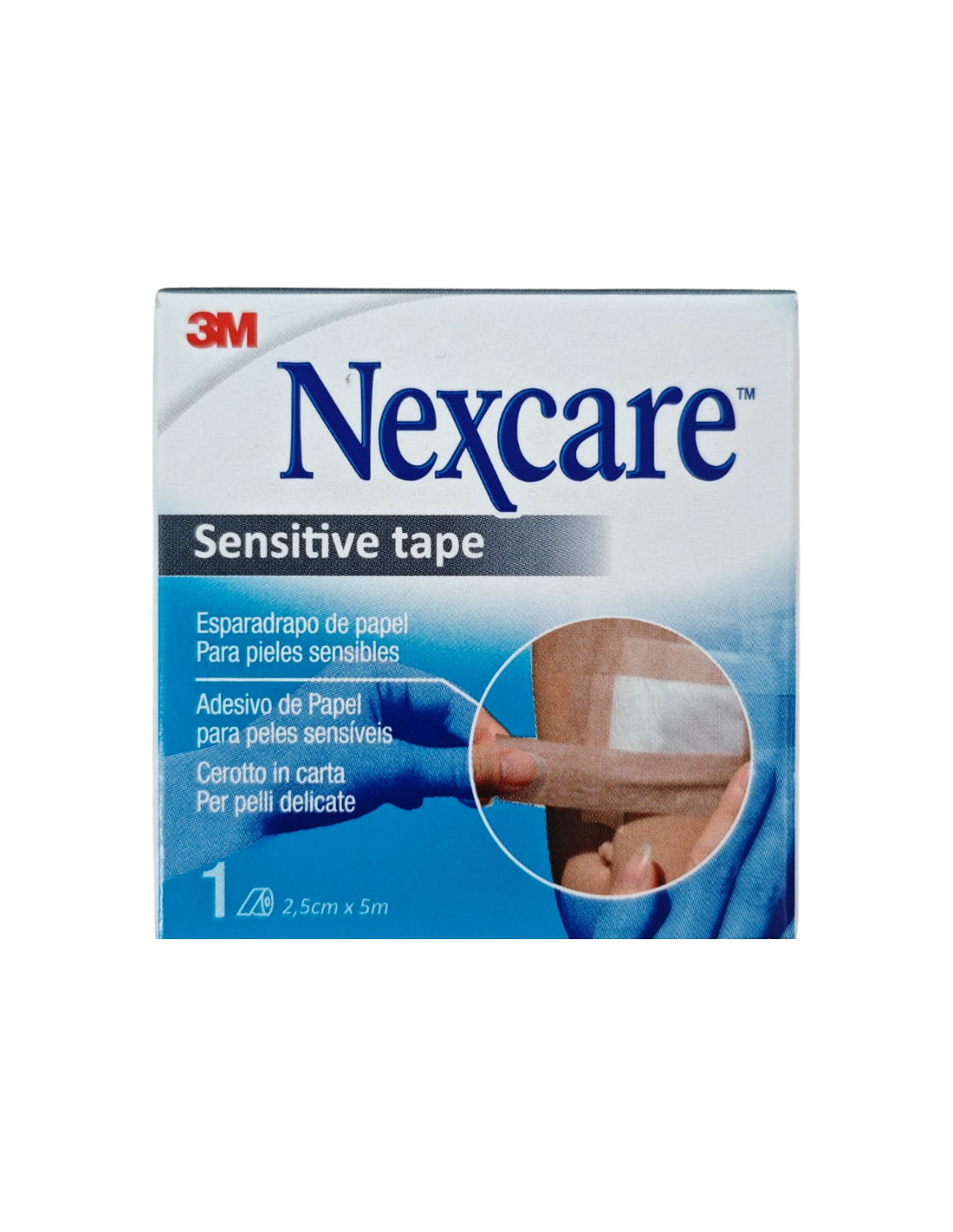 NEXCARE Sensitive Tape Esparadrapo de Papel 2,5 cm x 5 m contiene una cinta de papel microporoso transpirable con adhesivo hipoalergénico suave, libre de látex de origen natural, diseñada para ofrecer una fijación eficaz respetando la piel sensible y facilitando su retirada sin causar irritación.