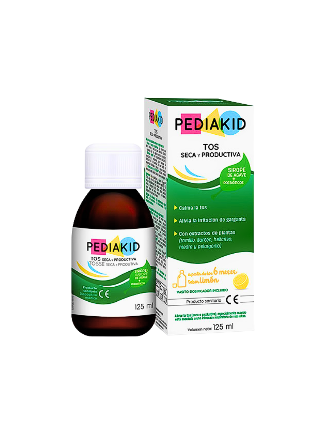 AQUILEA Pediakid Tos Seca y Productiva incluye: Agave Syrup (sirope de agave, edulcorante natural), Aqua (Water), Acacia Fibregum, Glycerin, Thymus Vulgaris Extract (extracto de tomillo, calmante), Plantago Major Extract (extracto de llantén, expectorante), Helichrysum Italicum Extract (extracto de helicriso, antiinflamatorio), Hedera Helix Extract (extracto de hiedra, facilita la expectoración), Pelargonium Graveolens Extract (extracto de pelargonio, alivia la tos), Citric Acid, Xanthan Gum, Natural Lemon Flavour (sabor natural a limón). Esta composición está libre de gluten, alérgenos y colorantes artificiales, garantizando un alivio suave y seguro para la tos en niños a partir de 6 meses.