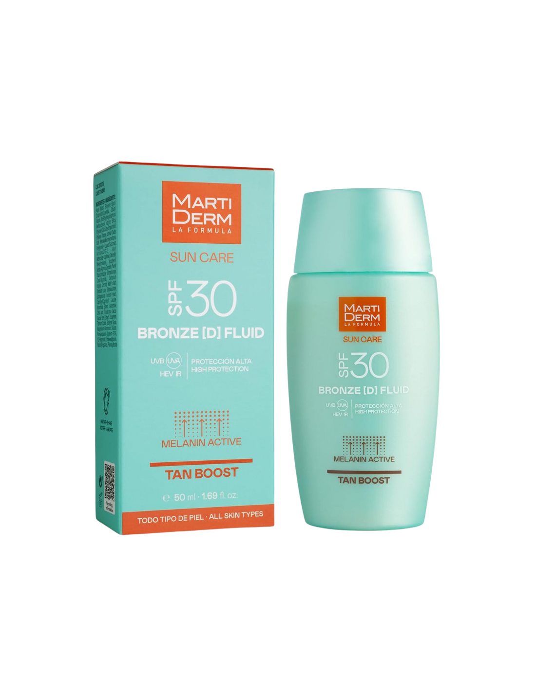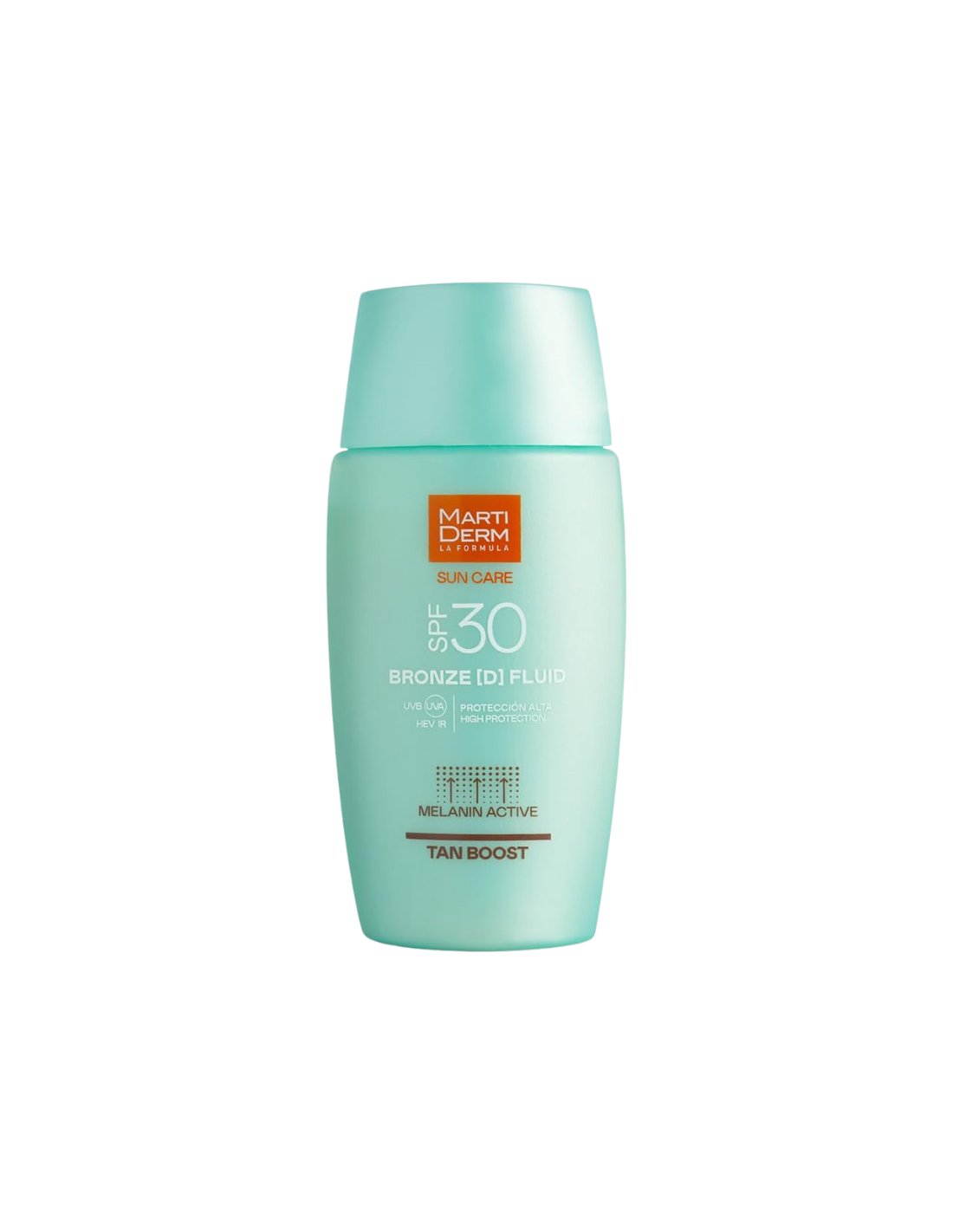 MARTIDERM Sun Care SPF30 Bronze [D] Fluid es un fotoprotector facial de textura ligera y fluida, ideal para proteger la piel de los daños solares mientras potencia y prolonga el bronceado de manera uniforme y radiante. Su fórmula cuida y mantiene la hidratación de la piel, previniendo signos de fotoenvejecimiento y ofreciendo un acabado fresco y confortable. Perfecto para pieles que buscan una protección solar eficaz junto con un efecto bronceado natural y duradero.