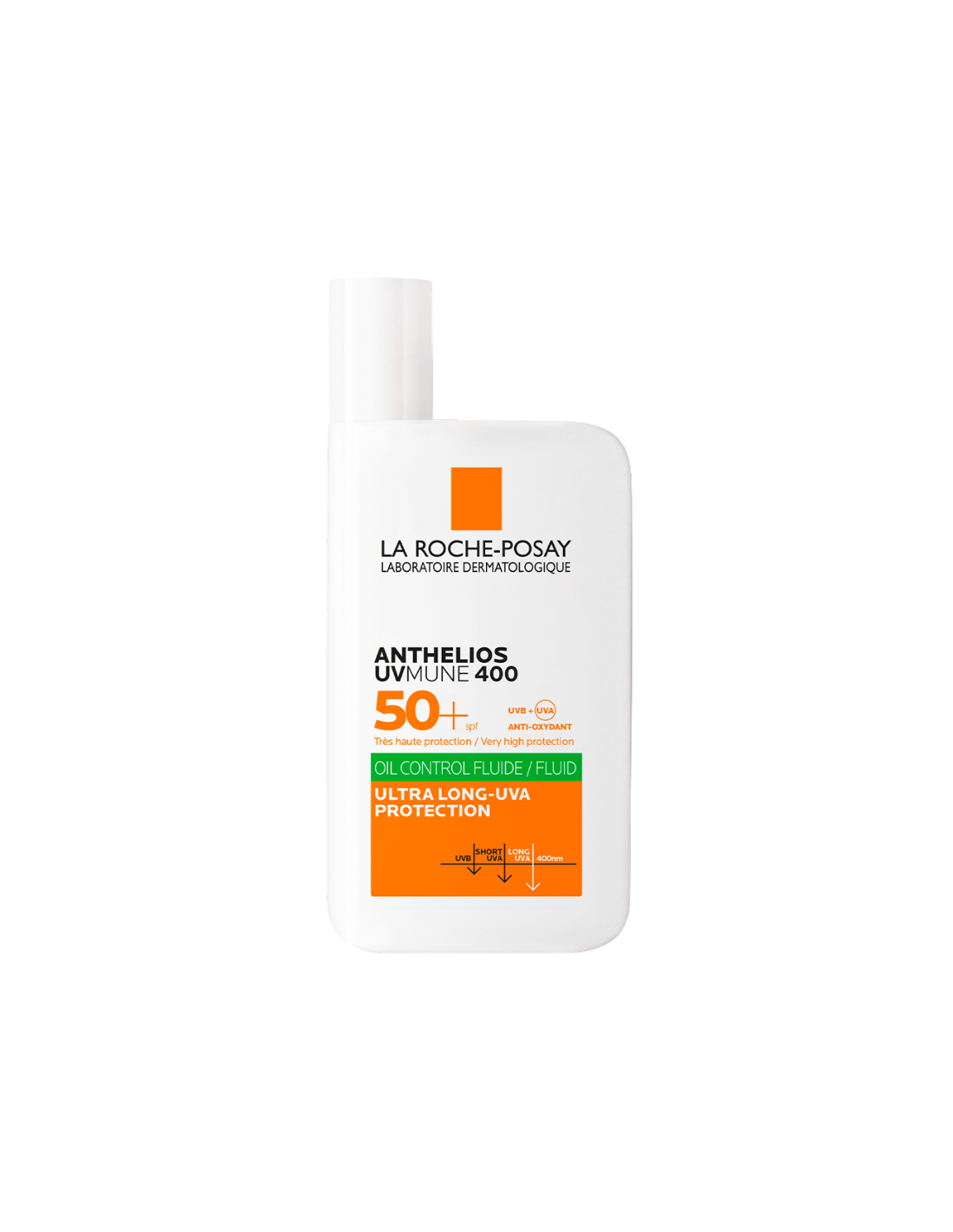 LA ROCHE-POSAY Anthelios UVMUNE 400 SPF50+ Fluido Oil Control es un protector solar facial de protección muy alta, especialmente diseñado para pieles mixtas a grasas y sensibles que necesitan una defensa eficaz contra los rayos UVB, UVA y UVA ultra-largos. Su textura fluida, ultraligera y no grasa se absorbe rápidamente, dejando un acabado invisible y matificante que ayuda a controlar los brillos durante horas sin marcas blancas ni sensación pegajosa. Gracias a su tecnología Oil-Control con micropartículas matificantes, contribuye a reducir el exceso de sebo, aportando confort y protección diaria incluso en condiciones de calor, humedad, sudor y agua.