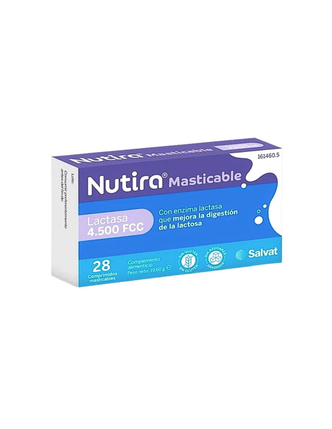 Nutira Lactasa 4500 FCC Comprimidos Masticables es un suplemento enzimático natural diseñado para mejorar la digestión de la lactosa en personas con intolerancia, ideal para adultos que buscan disfrutar de lácteos sin molestias digestivas como hinchazón, gases o diarrea, permitiendo una alimentación equilibrada sin restricciones. Esta fórmula descompone la lactosa en azúcares simples, facilitando su absorción intestinal y reduciendo síntomas de intolerancia láctea, siendo perfecta para comidas ricas en leche, queso o yogur. Este envase se integra fácilmente en rutinas diarias para una digestión óptima y un bienestar intestinal sostenido, promoviendo una vida sin limitaciones alimentarias.