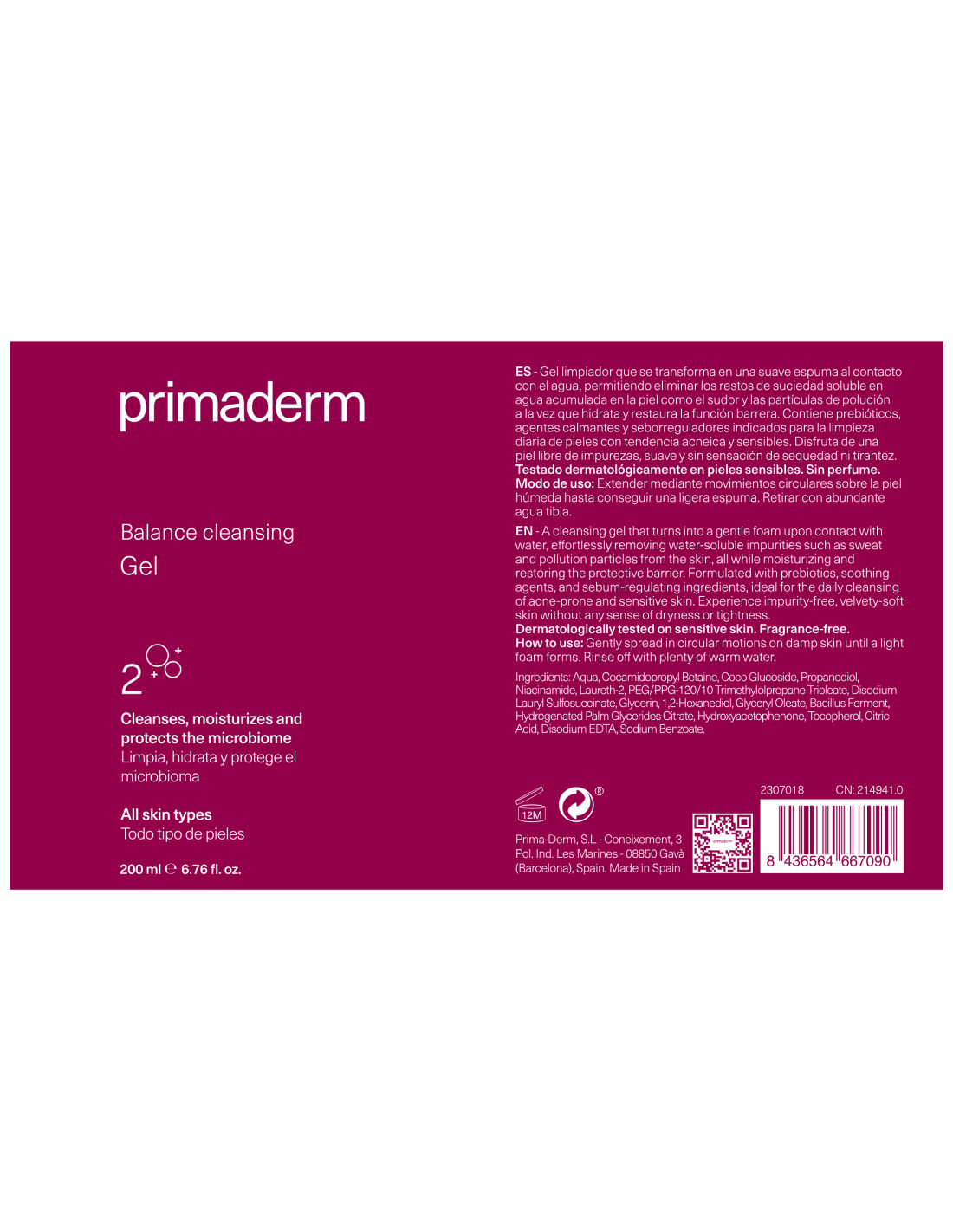 Primaderm Balance Cleansing Gel se transforma en una suave espuma al contacto con el agua, permitiendo eliminar los restos de suciedad soluble en agua acumulada en la piel como el sudor y las partículas de polución a la vez que hidrata y restaura la función barrera. Contiene prebióticos, agentes calmantes y seborreguladores indicados para la limpieza diaria de pieles con tendencia acneica y sensibles. Disfruta de una piel libre de impurezas, suave y sin sensación de sequedad ni tirantez.