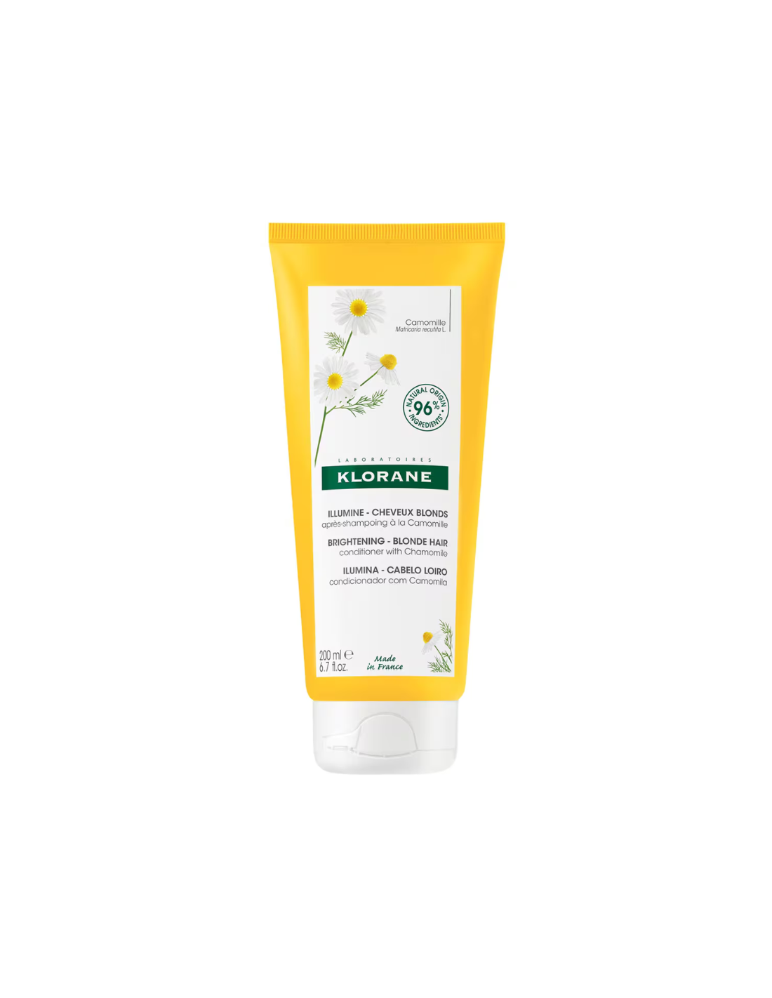 KLORANE Acondicionador a la Camomila es un acondicionador capilar especialmente formulado para realzar la luminosidad natural del cabello rubio o castaño claro, ya sea natural, teñido o con mechas, dejándolo más suave, sedoso y fácil de peinar tras cada lavado. Este bálsamo cremoso incorpora extracto de camomila (Matricaria recutita), rica en pigmentos vegetales como la apigenina que ayudan a intensificar los reflejos dorados y aportar brillo sin apelmazar la fibra capilar, al mismo tiempo que los agentes desenredantes suaves facilitan el peinado y la manejabilidad. Con una textura ligera que respeta la suavidad del cabello, este acondicionador nutre, repara y sella suavemente las cutículas, mejorando la textura, realzando el color y devolviendo un acabado luminoso y saludable al cabello.