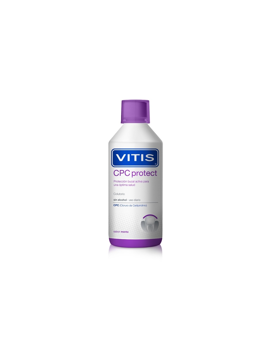 VITIS CPC Protect es un colutorio que ayuda a reducir la placa dental (biofilm), ofreciendo una protección bucal activa gracias a su elevada concentración de Cloruro de Cetilpiridinio (CPC).