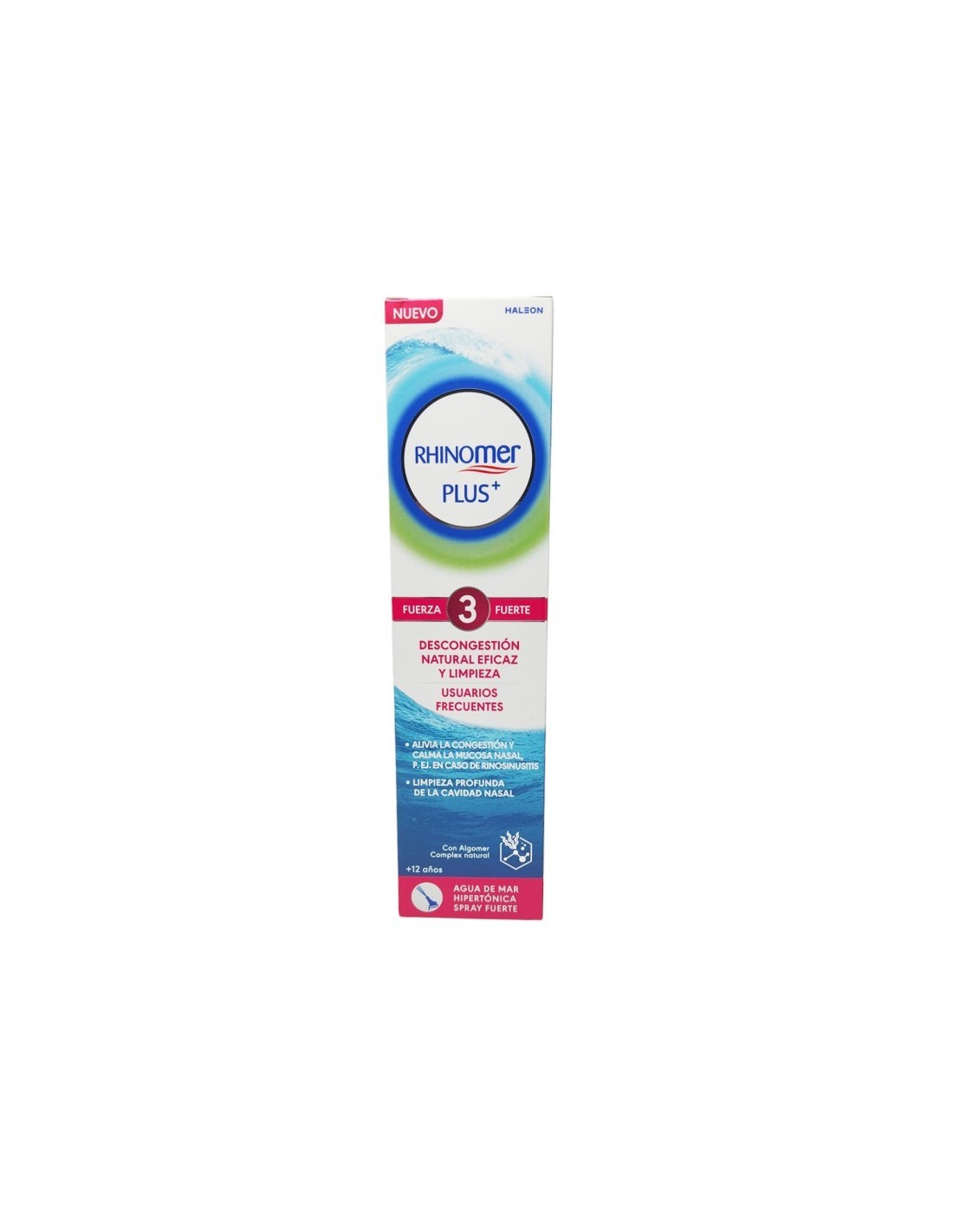 RHINOMER Plus Fuerza 3 Fuerte es un spray nasal hipertónico de agua de mar 100% natural, diseñado para ofrecer una descongestión potente y una limpieza profunda de las fosas nasales en adultos y niños mayores de 12 años. Este producto alivia eficazmente la congestión nasal causada por resfriados, sinusitis o alergias, gracias a su fórmula enriquecida con Algomer Complex, que combina extractos de algas marinas para calmar e hidratar la mucosa nasal. Ideal para usuarios frecuentes que buscan un alivio rápido y duradero, RHINOMER Plus Fuerza 3 elimina mucosidades, alérgenos y agentes infecciosos, promoviendo una respiración más libre y confortable sin conservantes ni medicamentos, lo que lo hace perfecto para un cuidado nasal natural y seguro.