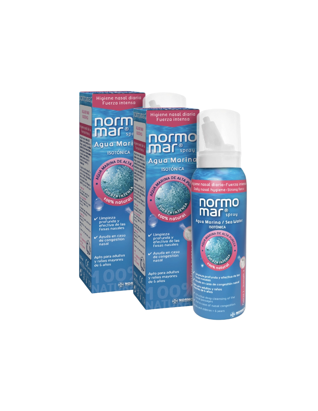 Normomar Duplo Spray Agua de Mar Isotónica Fuerza Intensa es un spray nasal sanitario de doble pack para una higiene diaria intensiva. Este producto ofrece una acción de arrastre potente (fuerza F3) que limpia en profundidad las fosas nasales, elimina alérgenos, contaminantes, polvo, suciedad y polen, aliviando la congestión nasal y promoviendo una respiración clara y confortable. Ideal para adultos y niños mayores de 6 años en periodos de resfriados, alergias o exposición ambiental, asegura un lavado nasal efectivo y preventivo, con mayor intensidad que las versiones suaves. Perfecto para rutinas de higiene nasal prolongadas, proporcionando alivio inmediato y protección diaria contra irritaciones, con resultados visibles en la descongestión y frescura nasal.