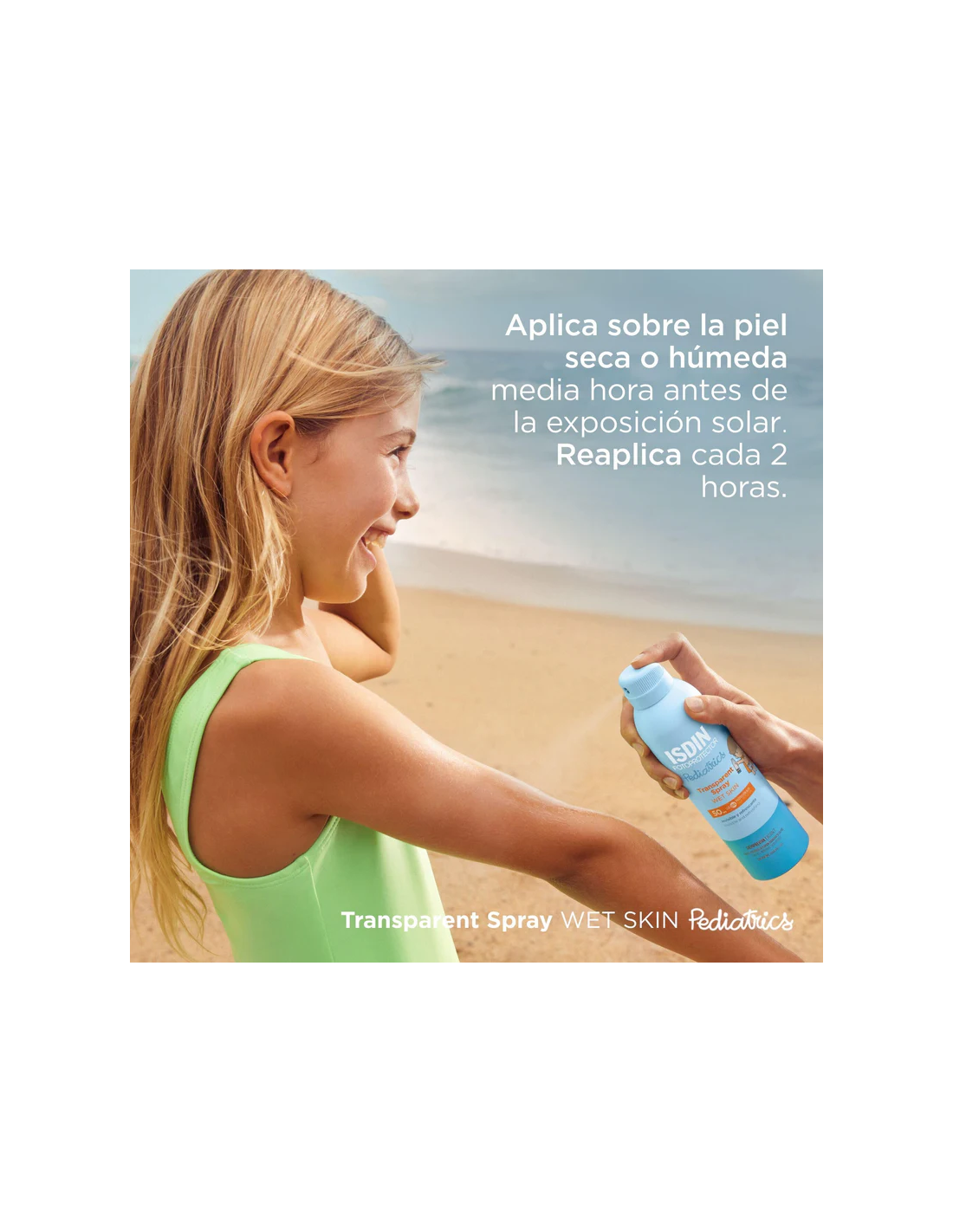 Isdin Fotoprotección Transparente Spray Wet Skin Pediatrics SPF50 está indicado para proteger la piel de los niños a partir de los 3 años.