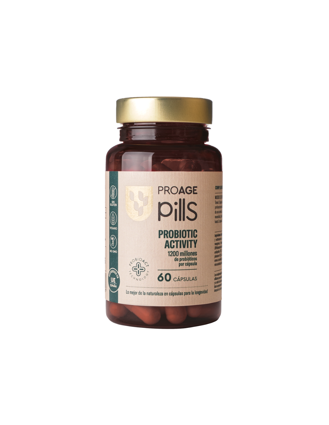 PROAGE Probiotic Activity Cápsulas incluye: Megaflora 9 EVO polvo 2,0×109 ufc/g [agentes de carga (almidón, maltodextrinas y maltodextrinas de maíz), estabilizantes* (cloruro potásico, sulfato de magnesio, sulfato de manganeso, fructooligosacáridos, inulina, proteína vegetal hidrolizada) cepas bacterianas (Bifidobacterium lactis W51, Bifidobacterium lactis W52, Enterococcus faecium W54, Lactobacillus acidophilus W22, Lactobacillus paracasei W20, Lactobacillus plantarum W1, Lactobacillus plantarum W21, Lactobacillus salivarius W24, Lactococcus lactis W19), estabilizante (amilasa), aroma de vainilla], agente de recubrimiento (hidroxipropilmetilcelulosa); agente de carga (celulosa microcristalina); antiaglomerante (sales magnésicas de ácidos grasos).