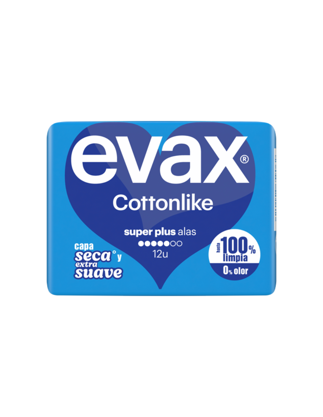 EVAX Cottonlike Super Plus con Alas Compresas están fabricadas con una cobertura suave tipo algodón (Cottonlike) que proporciona confort y transpirabilidad, un núcleo absorbente con perlas activas que neutralizan el olor y retienen el flujo al instante, y alas adaptables que mantienen la compresa firmemente en su sitio. Todos los materiales son seguros, hipoalergénicos y dermatológicamente testados para cuidar la piel incluso en los días más sensibles.
