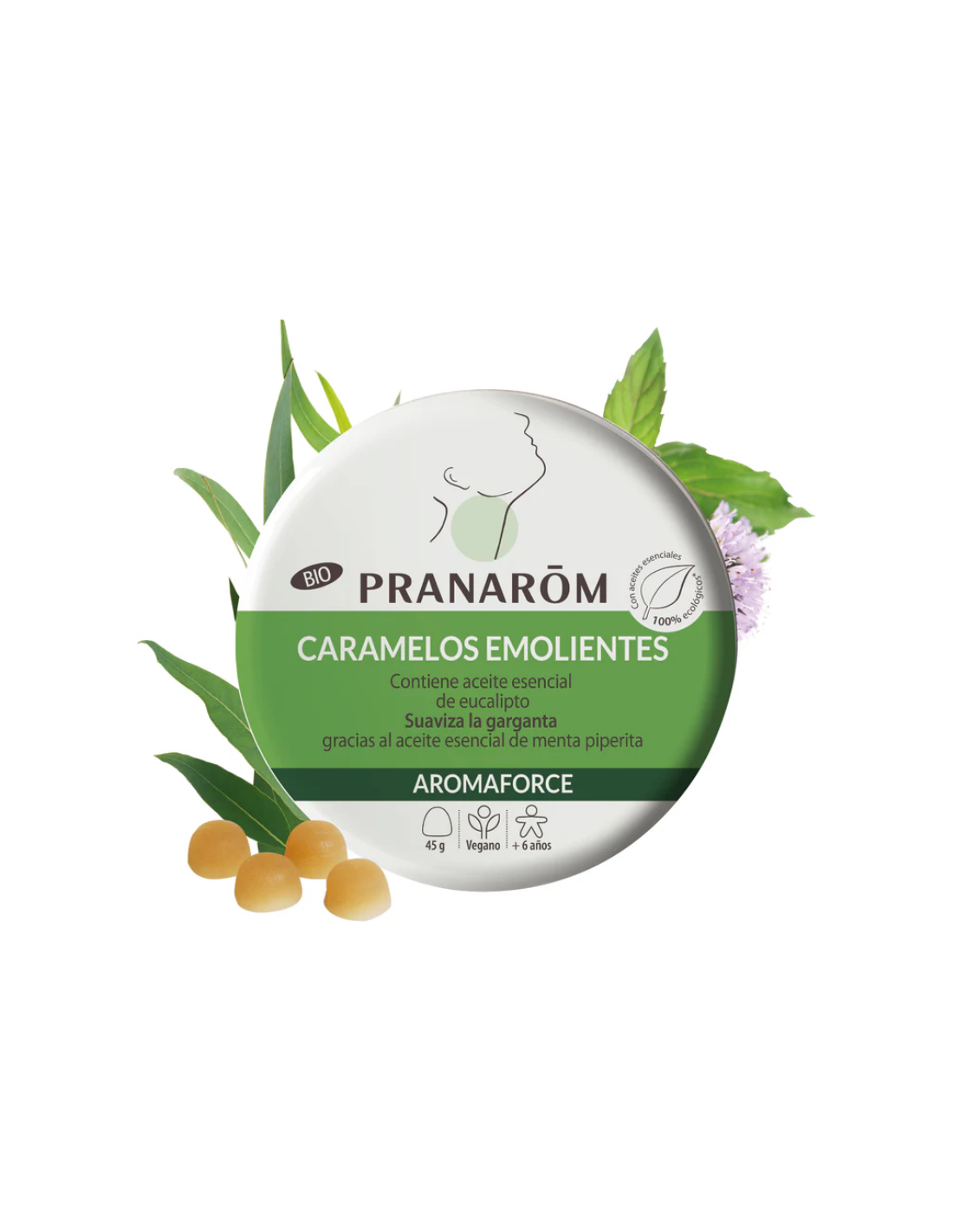 PRANAROM Aromaforce Caramelos Emolientes Menta/Eucalipto son caramelos ecológicos formulados con aceites esenciales 100% de origen biológico que ayudan a suavizar la garganta irritada o ronca, en épocas de resfriado, cambios de estación o aire seco. Su sabor fresco y agradable combina la potencia del eucalipto con la sensación refrescante de la menta, proporcionando un alivio natural y duradero mientras purifican la cavidad bucal y aportan una sensación de bienestar inmediato al ser chupados.