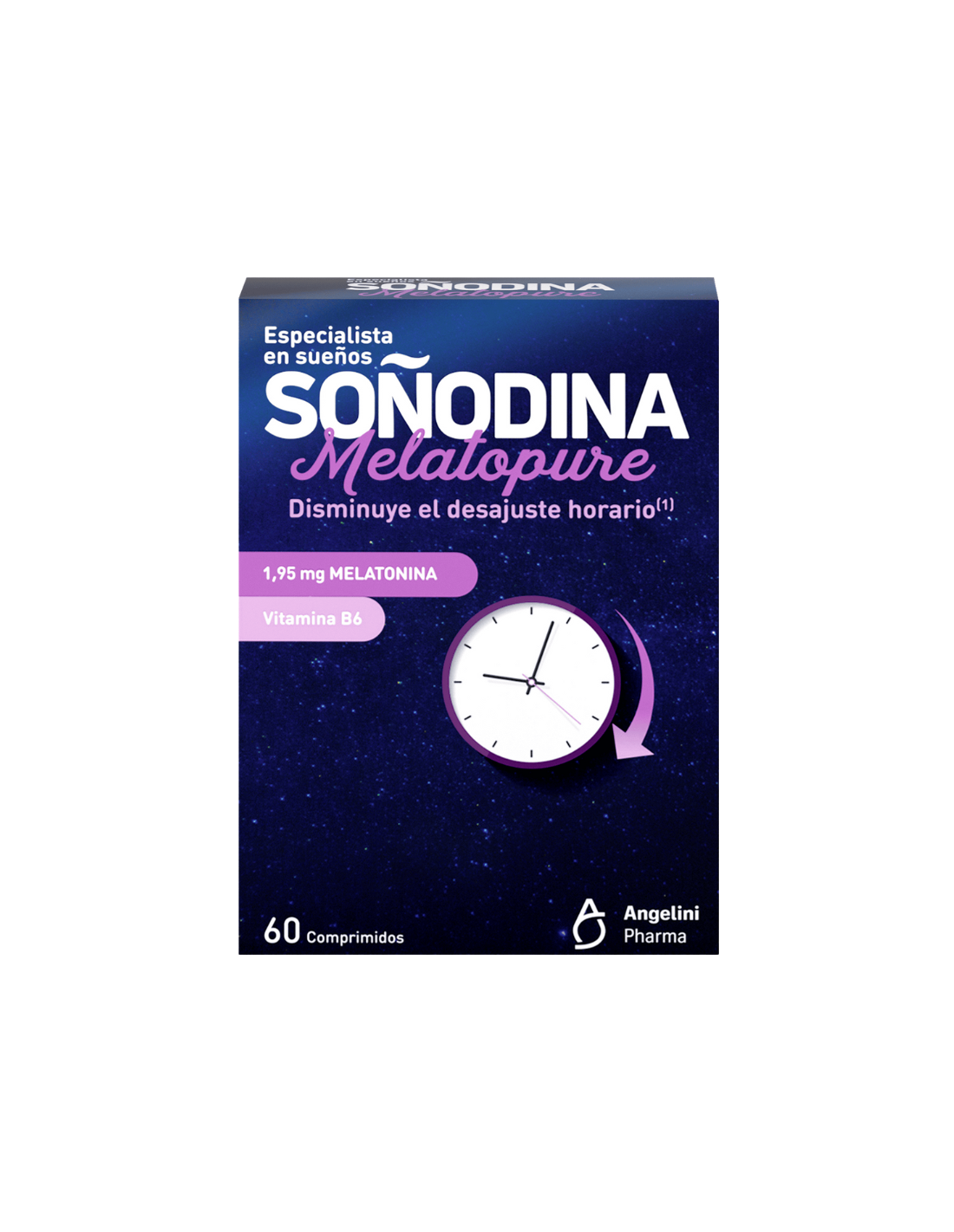 SOÑODINA Melatopure Comprimidos es un complemento alimenticio formulado para favorecer un descanso reparador y regular el ciclo natural del sueño. Gracias a su contenido en melatonina (1,95 mg), ayuda a reducir el tiempo necesario para conciliar el sueño y contribuye a aliviar la sensación de desajuste horario (jet lag), favoreciendo una adaptación más rápida a los cambios de horario o rutinas. Además, la vitamina B6 contribuye al funcionamiento normal del sistema nervioso y al metabolismo energético, ayudando a disminuir el cansancio y la fatiga para despertar con sensación de bienestar.