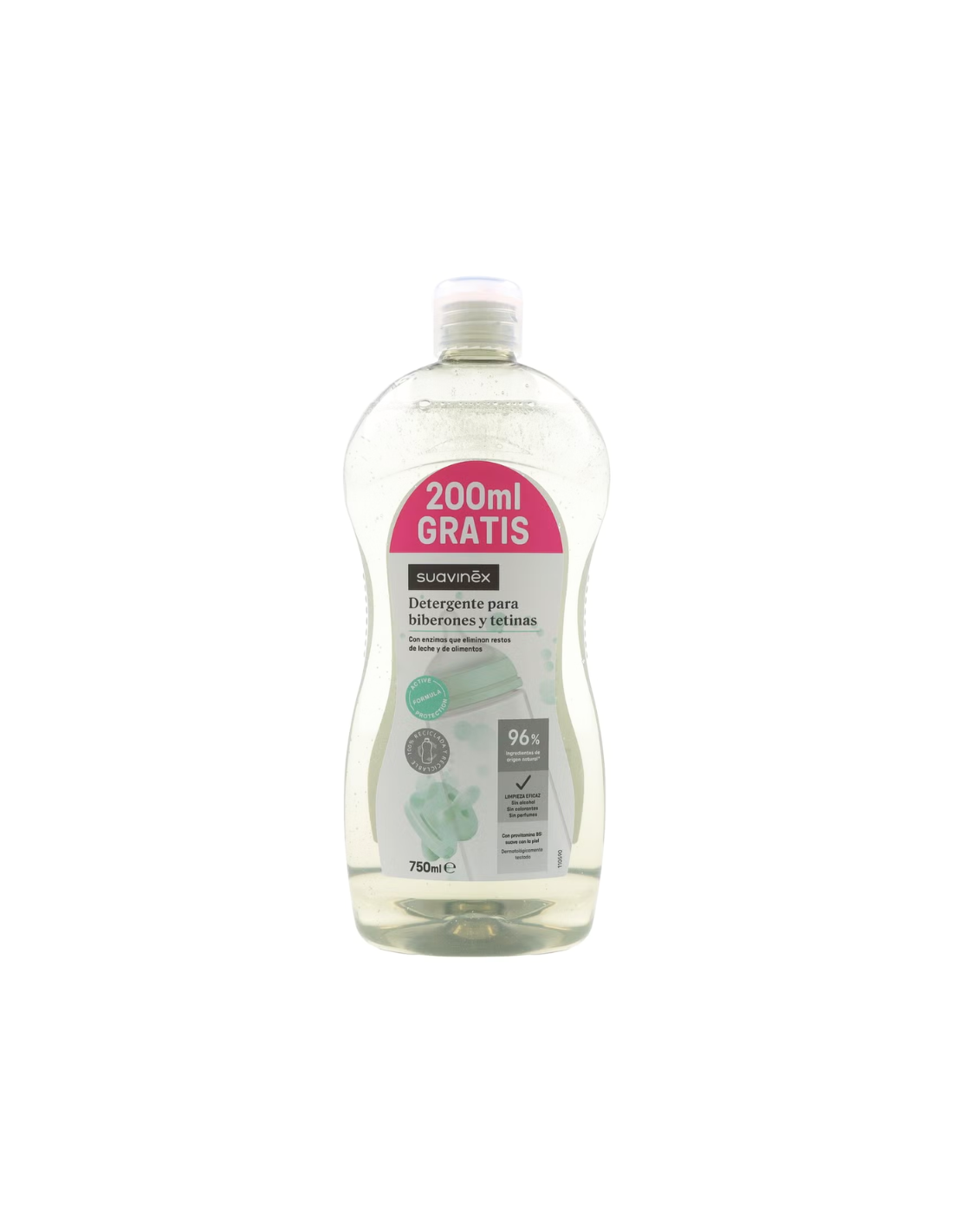 SUAVINEX Detergente para Biberones y Tetinas es un detergente líquido especialmente formulado para una limpieza eficaz y segura de biberones, tetinas, chupetes y accesorios del bebé. Su fórmula con enzimas activas ayuda a eliminar de forma efectiva los restos de leche, papillas y alimentos, incluso en zonas de difícil acceso. Contiene un 96% de ingredientes de origen natural, no contiene alcohol, perfumes ni colorantes y ha sido dermatológicamente testado, lo que lo hace adecuado para el uso diario en utensilios que están en contacto directo con el bebé. Su textura fluida facilita el aclarado y no deja residuos.