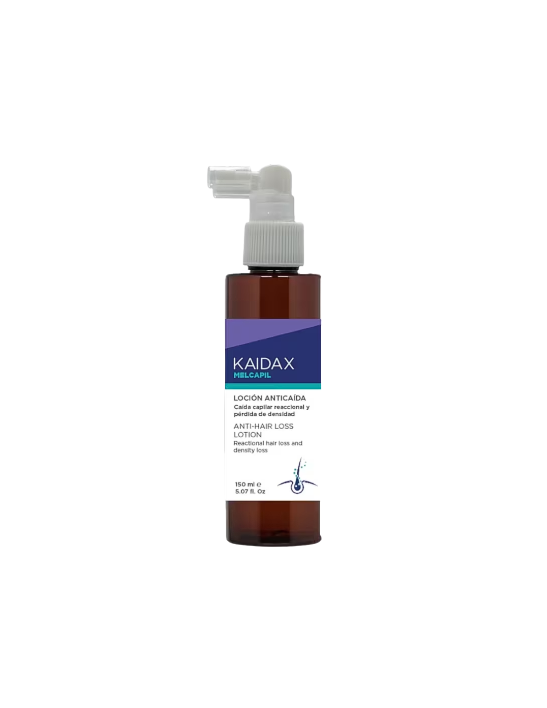 KAIDAX Melcapil Loción Anticaída es un tratamiento tópico en formato spray diseñado específicamente para prevenir, controlar y tratar la caída capilar reaccional y la pérdida de densidad, ideal para mujeres y hombres con alopecia androgenética, alopecia telogénica o estacional, causada por estrés, cambios hormonales o deficiencias nutricionales. Esta loción nutre y regenera el cabello débil y frágil, fortaleciendo el folículo piloso con complejos que mejoran el metabolismo capilar, activan la microcirculación y bloquean la DHT para evitar el cierre folicular, estimulando el crecimiento y aumentando la densidad. Proporciona un efecto protector, energizante y reparador, siendo perfecta para cueros cabelludos sensibles.