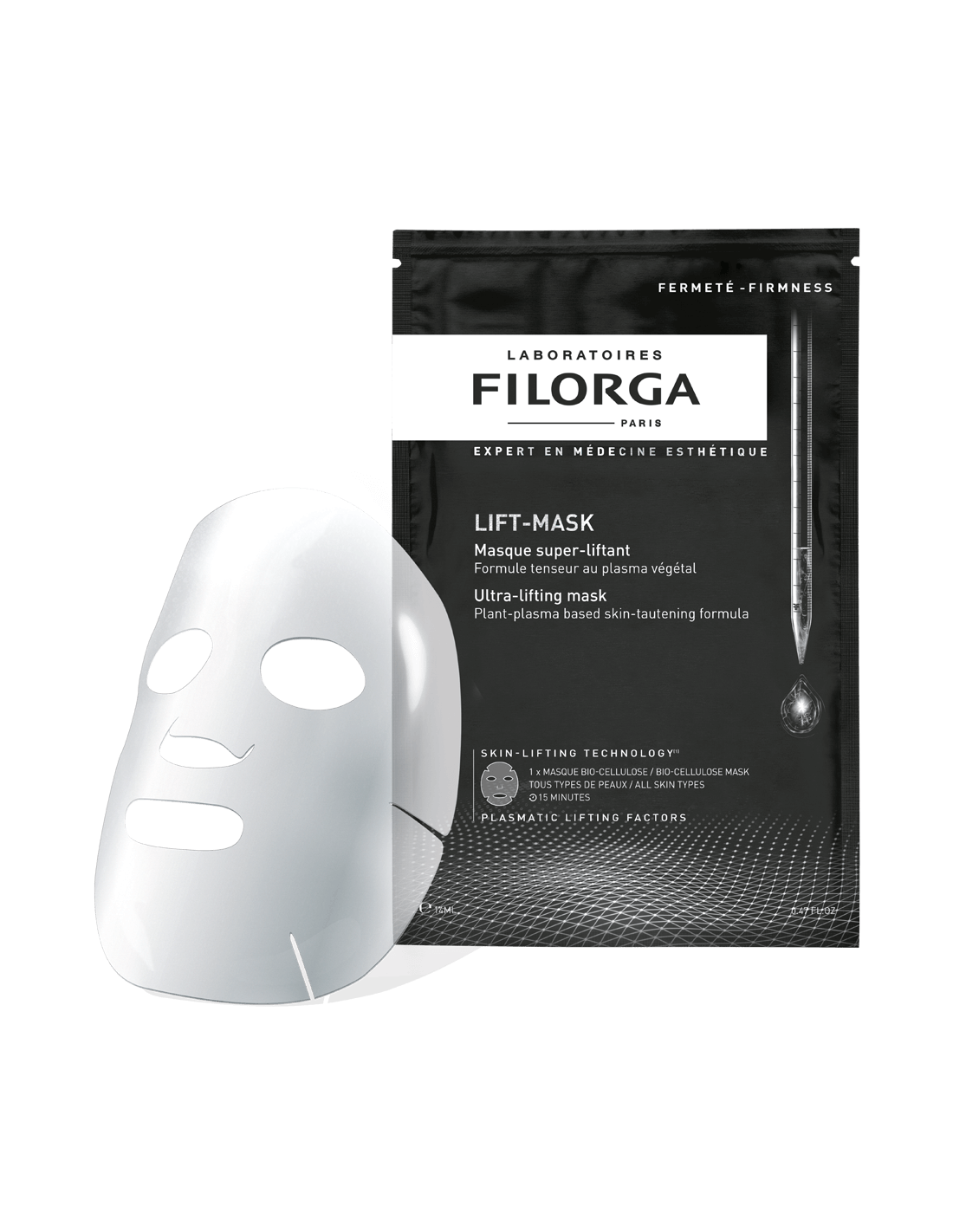 FILORGA Lift-Mask proporciona resultados instantáneos, LIFT-MASK integra la Skin-Lifting Technology: una textura biocelulosa constituida de fibras ultrafinas de celulosa obtenida por biofermentación. Esta textura inédita ofrece un efecto segunda piel ultrarrefrescante. La mascarilla se adhiere perfectamente a las curvas del rostro y la piel se impregna de principios activos para un efecto tensor inmediato.