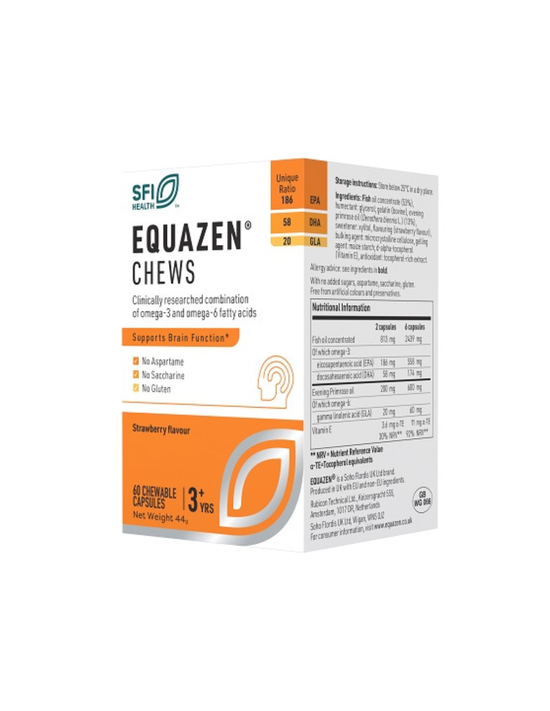 VITAE Equazen Chews Cápsulas contiene aceite de pescado rico en ácidos grasos Omega‑3 (EPA y DHA) y aceite de onagra rico en Omega‑6 (GLA) en una proporción equilibrada adecuada para apoyar funciones cognitivas. La fórmula masticable incorpora también vitamina E como antioxidante, junto con otros excipientes como agentes de sabor y textura que facilitan su toma y mejoran la experiencia de uso.