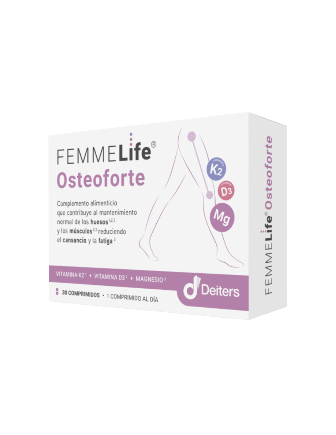 FEMMELife Osteoforte es un complemento alimenticio especialmente desarrollado para mujeres a partir de los 45-50 años y en etapa de menopausia/postmenopausia. Contribuye al mantenimiento de los huesos en condiciones normales gracias al calcio, magnesio, vitamina D y K, que ayudan a prevenir la pérdida ósea asociada al descenso de estrógenos. Refuerza la densidad mineral ósea, reduce el riesgo de osteoporosis y favorece la salud musculoesquelética. Con una fórmula completa y biodisponible, ofrece un apoyo integral para mantener la fuerza ósea, la movilidad y el bienestar durante esta etapa de cambio hormonal. Ideal para mujeres preocupadas por la salud de sus huesos.