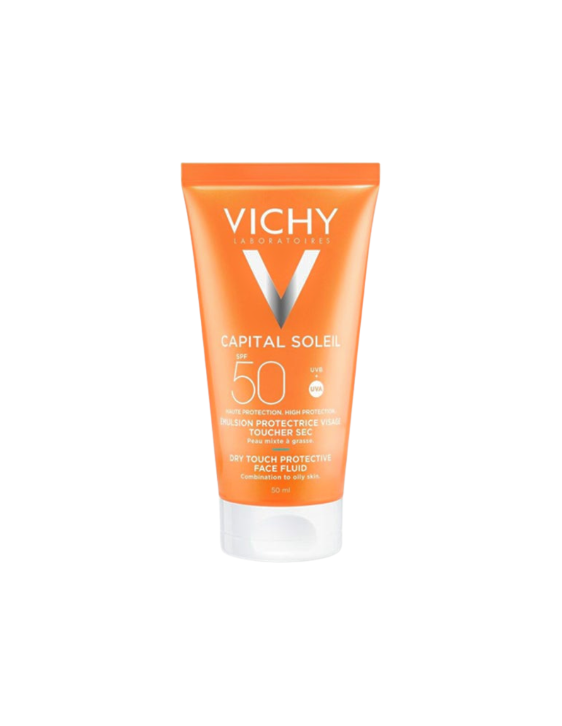 VICHY Capital Soleil SPF50+ Crema Protectora Rostro Toque Seco es una fotoprotección facial de muy alta protección (SPF50+) especialmente formulada para piel mixta a grasa, que ofrece un acabado mate duradero y control de los brillos, gracias a su textura ligera y a rápida absorción. Su nueva fórmula combina filtros solares de amplio espectro frente a los rayos UVB y UVA, ayudando a prevenir quemaduras solares y el daño cutáneo asociado a la exposición solar diaria, incluyendo el fotoenvejecimiento. Adecuada para pieles sensibles con tendencia al exceso de sebo. Su sistema absorbente contribuye a mantener la piel con un aspecto seco y uniforme, sin sensación grasa ni efecto pesado. Además, es resistente al agua, lo que la hace adecuada para actividades al aire libre.