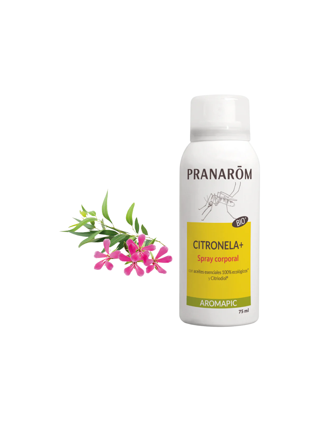 PRANAROM Aromapic Spray Cuerpo Citronela+ contiene: Con aceites esenciales 100% ecológicos* : Eucalipto azul, Palmarosa, Lemongrass, Citronela de Madagascar,Geranio, Clavo de especias, Jengibre. +Citriodiol®. *Ingrediente procedente de la Agricultura Ecológica (Control Certisys BE-BIO-01). **Componente natural presente en los aceites esenciales. Esta fórmula vegana, certificada por Ecogarantie, combina aceites esenciales quimiotipados con propiedades repelentes y calmantes, ofreciendo una protección natural contra insectos, sin DEET ni químicos agresivos, ideal para pieles sensibles.