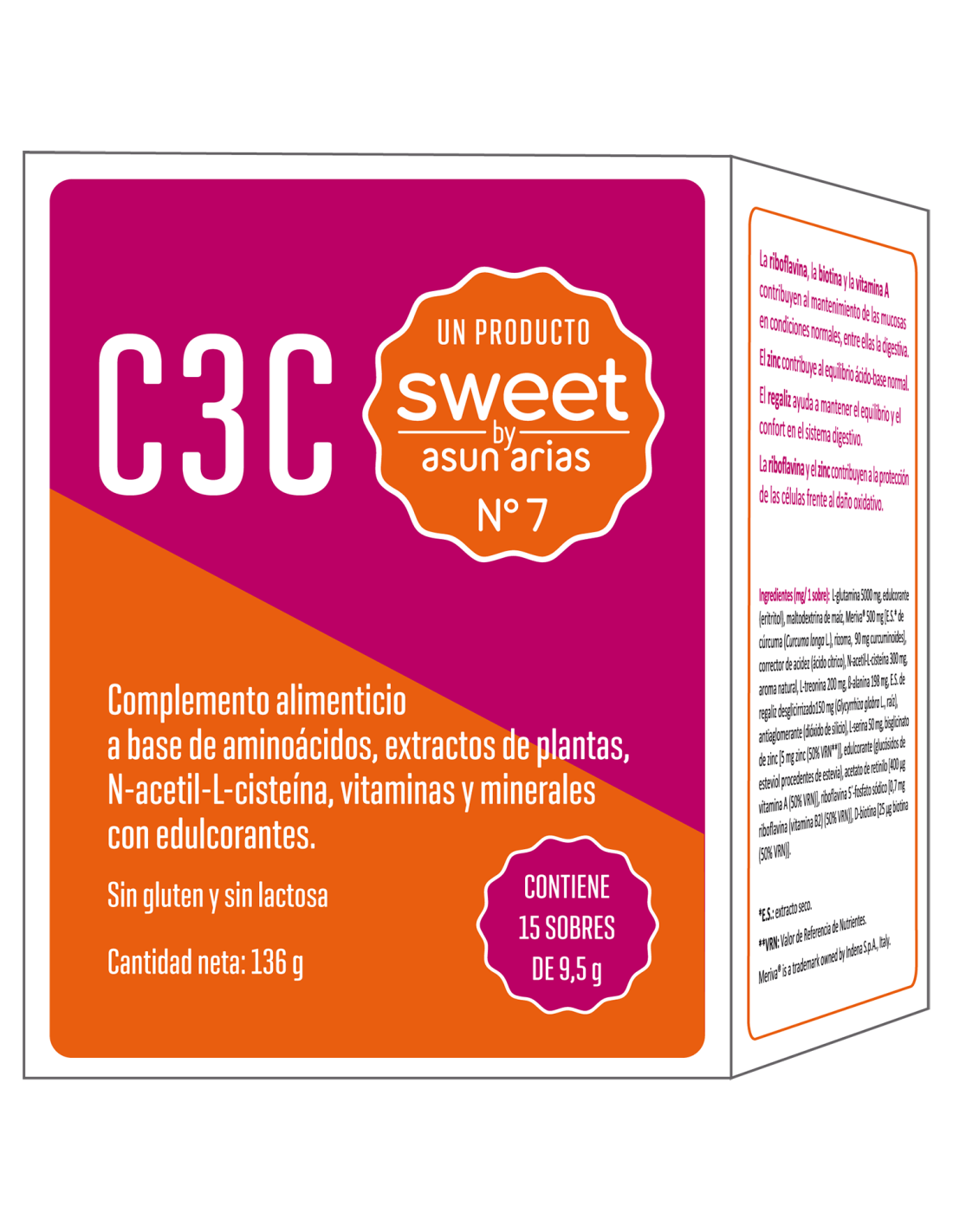 SWEET C3C Sobres es un complemento alimenticio en polvo efervescente formulado con aminoácidos, extractos de plantas, N-acetil-L-cisteína, vitaminas y minerales, diseñado para apoyar el sistema respiratorio, potenciar las defensas y combatir el estrés oxidativo en adultos. Este producto ayuda a mantener las mucosas sanas, mejora la respuesta inmunitaria gracias a la vitamina C y el zinc, y favorece la detoxificación del organismo con sus antioxidantes naturales, siendo ideal para épocas de resfriados, alergias o fatiga. Con un agradable sabor gracias a sus edulcorantes naturales, SWEET C3C es una solución práctica y deliciosa para complementar una dieta equilibrada, ofreciendo bienestar general y protección celular en cada sobre.