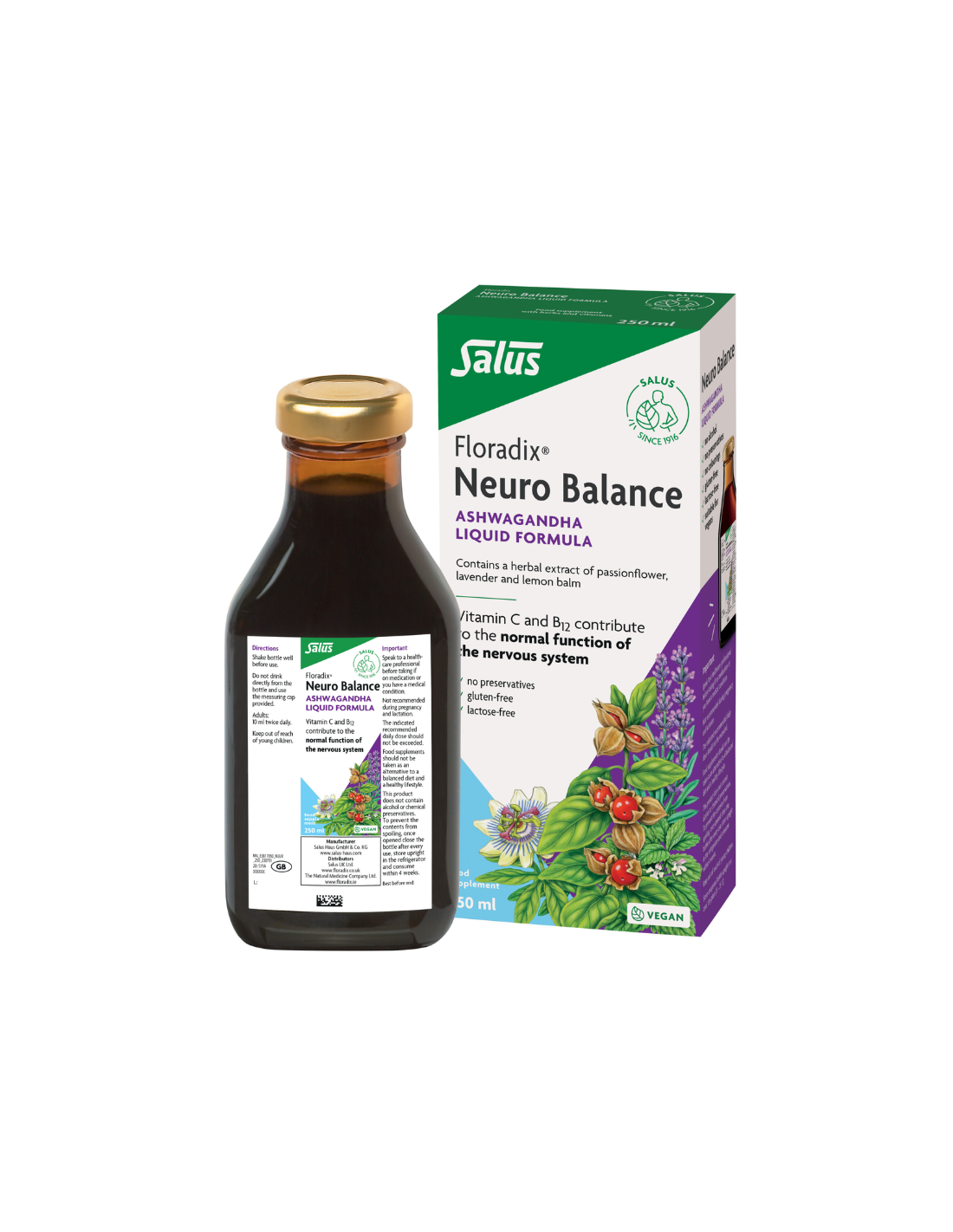 Neuro Balance Ashwagandha es un suplemento alimenticio, diseñado específicamente para combatir el cansancio físico y mental, reducir el estrés y promover la relajación diaria. La ashwagandha, un adaptógeno tradicional, es útil en casos de fatiga y agotamiento, mientras que la lavanda y la pasiflora ayudan a calmar la mente en momentos de tensión, y las vitaminas B12 y C contribuyen al metabolismo energético y al funcionamiento normal del sistema nervioso. Este producto es perfecto para adultos que buscan un apoyo natural para el equilibrio emocional y la vitalidad, integrándose fácilmente en rutinas diarias para un bienestar mental óptimo y una energía sostenida, ideal para estilos de vida activos o estresantes.