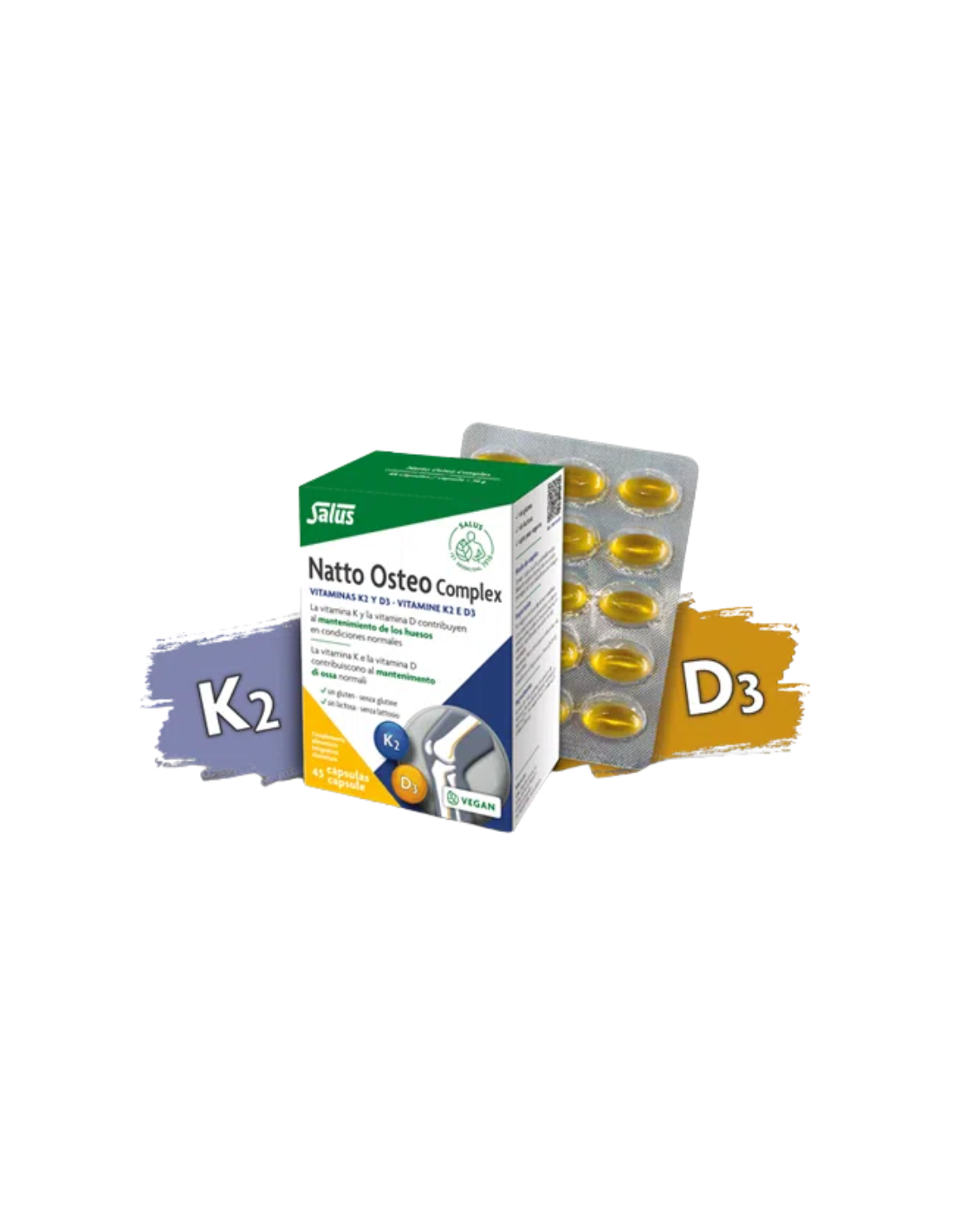 Natto Osteo Complex K2 y D3 Cápsulas contiene: Aceite de lino virgen, gelatina de almidón de tapioca; humectante: glicerol; vitamina K2 (MenaQ7® – menaquinona-7), vitamina D3 (colecalciferol).