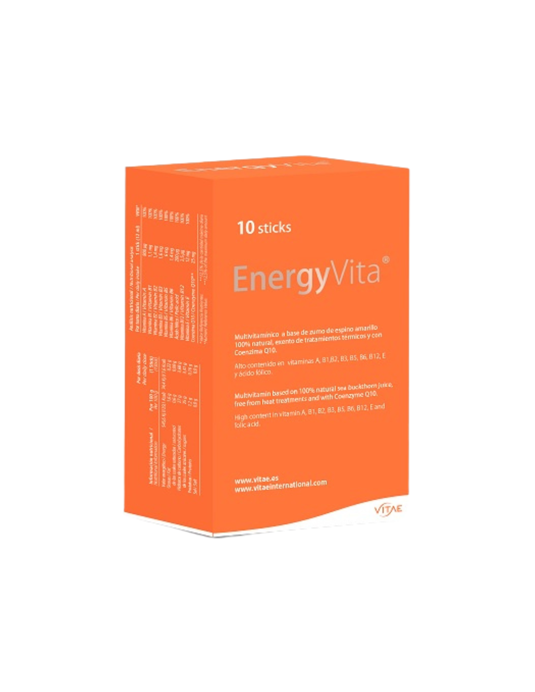 VITAE EnergyVita Sticks contiene: Zumo de espino amarillo (Hippophae rhamnoides), sirope de agave en polvo, puré de calabaza, Vitamina E, conservantes: Sorbato potásico, ácido cítrico anhidro; coenzima Q10, Vitamina B3 (Nicotinamida), Vitamina A, Vitamina B5 (Pantotenato cálcico), Vitamina B6, aroma natural, Vitamina B2, Vitamina B1, Vitamina B9 (Ácido fólico), Vitamina B12.