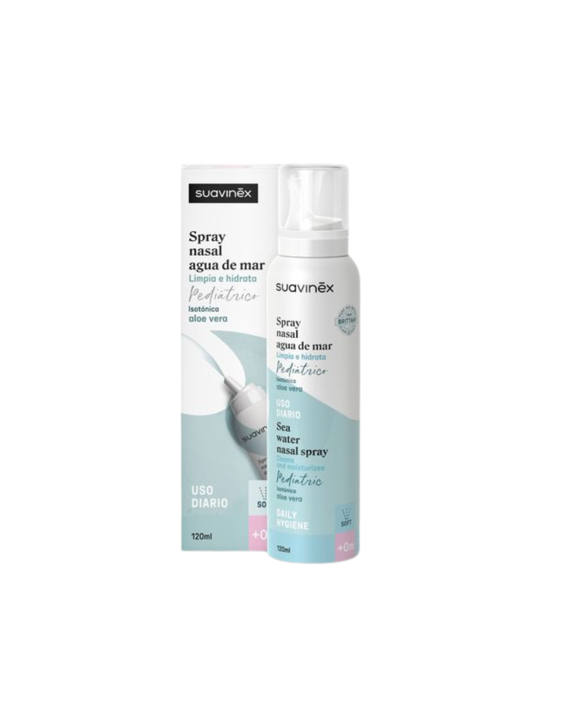 SUAVINEX Spray Nasal Agua de Mar +0 Meses Soft es una solución nasal isotónica especialmente formulada para la higiene diaria de la cavidad nasal del bebé desde el nacimiento. Su fórmula con agua de mar natural y aloe vera limpia suavemente las fosas nasales, ayudando a eliminar mucosidad, polvo y alérgenos que pueden dificultar la respiración. Gracias a su sistema de pulverización suave “Soft”, está adaptado a la delicada anatomía nasal del recién nacido, proporcionando una aplicación cómoda y segura. Además, contribuye a hidratar la mucosa nasal y a prevenir la sensación de sequedad, facilitando la respiración del bebé, especialmente durante resfriados o en ambientes secos.