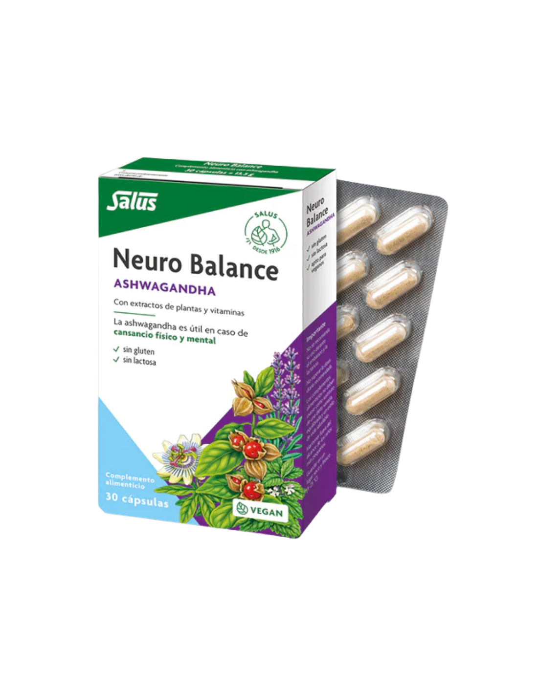 Neuro Balance Ashwagandha Cápsulas es un complemento alimenticio formulado para apoyar el funcionamiento normal del sistema nervioso y ayudar a combatir la fatiga física y mental en situaciones de estrés o de alta exigencia cognitiva. Su combinación de extractos de plantas como ashwagandha, melisa, pasiflora y lavanda, junto con vitaminas del grupo B, contribuye a mantener el equilibrio emocional y el rendimiento intelectual, favoreciendo la claridad mental y la sensación de bienestar en personas con cargas diarias intensas o en períodos de nerviosismo. Gracias a su efecto tónico-adaptógeno y a sus micronutrientes específicos, ayuda a mantener un ritmo vital más equilibrado y una sensación de energía más estable.