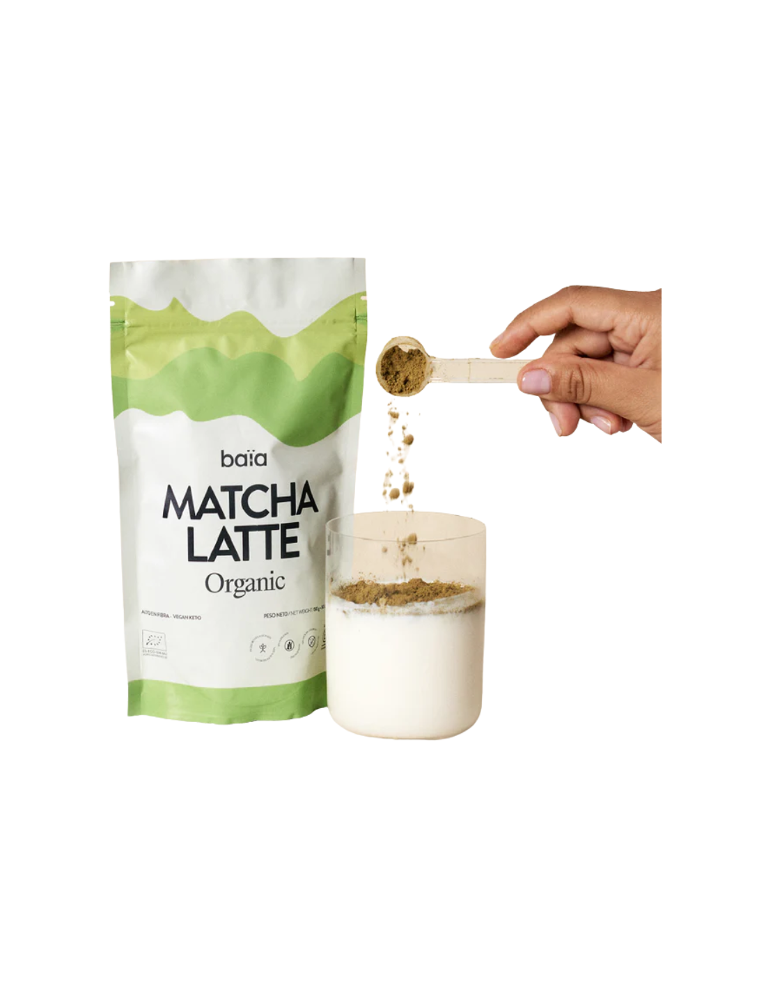 BAÏA Matcha Latte contiene: Bebida de coco en polvo, matcha ceremonial en polvo, canela en polvo, proteína de arroz, aroma natural, goma guar y vainilla.