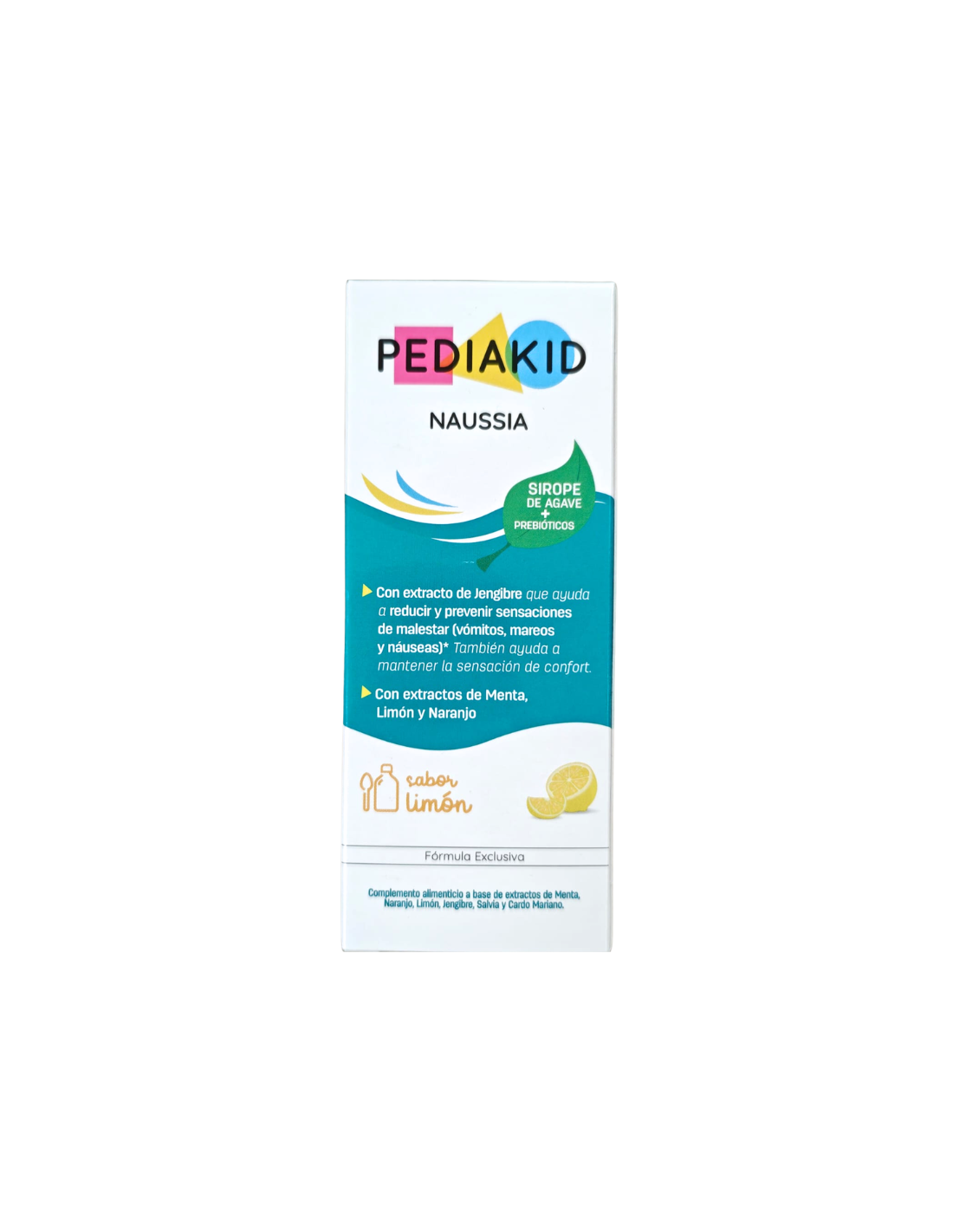 AQUILEA Pediakid Naussia contiene sirope de agave como base natural, prebióticos y una combinación de extractos vegetales como jengibre, menta, naranjo, salvia y cardo mariano, conocidos por sus propiedades digestivas y calmantes. Además, incorpora aroma natural de limón que aporta un sabor agradable y facilita su consumo en niños.