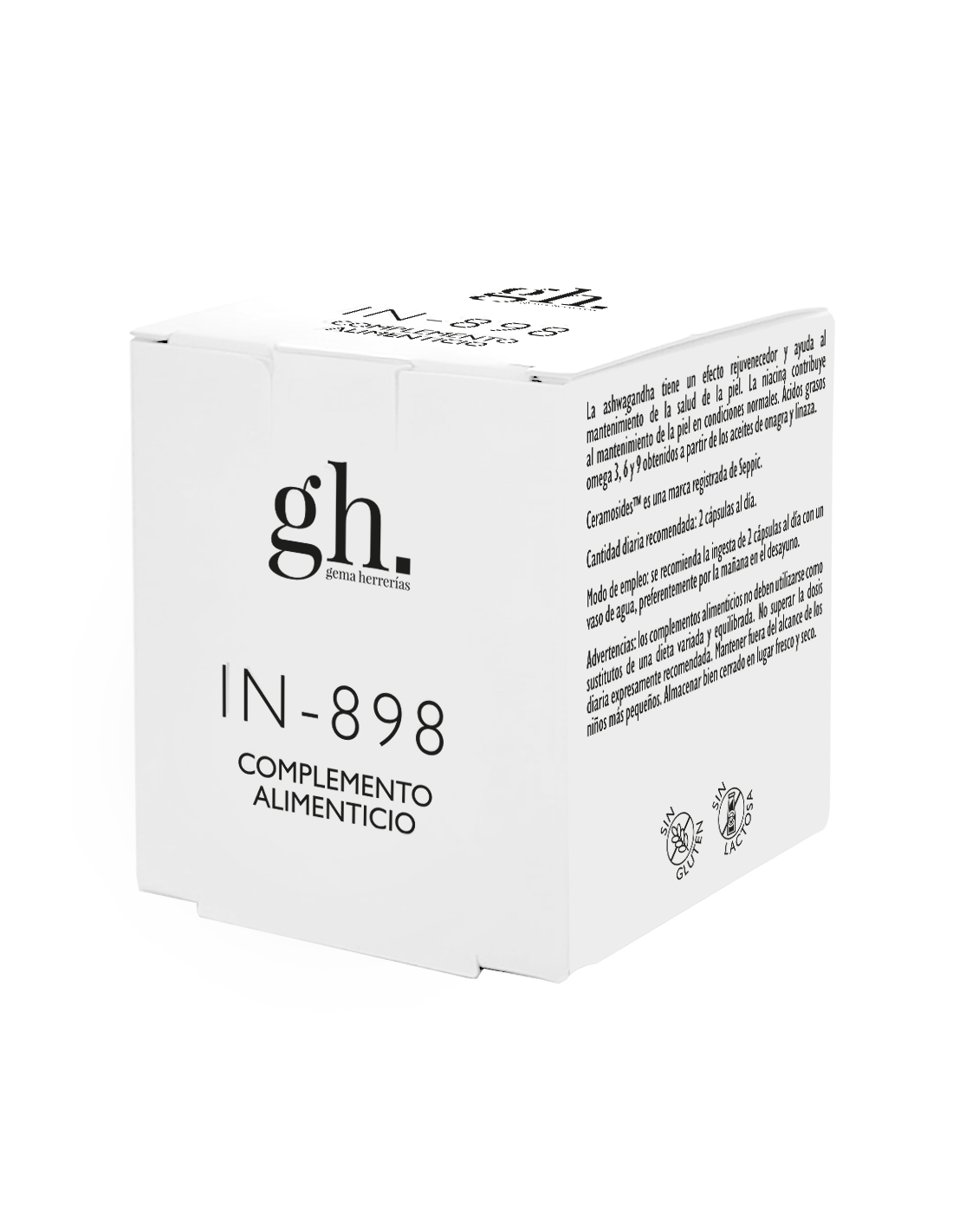 GEMA HERRERIAS IN-898 Antiedad es un complemento alimenticio elaborado a base de fitoceramidas (CeramosidesTM), ácidos grasos omega 3, 6 y 9 obtenidos a partir de los aceites de onagra y linaza, ácido hialurónico, ashwagandha (KSM-66®), niacina (fuente de nicotinamida) y bisglicinato de magnesio quelado tamponado. Formulado para mejorar los signos de envejecimiento como son las arrugas y la falta de elasticidad. Con efecto antioxidante, hidratante y reparador de la función barrera de la piel. Indicado en caso de piel seca y/o deshidratada, piel sensible con función barrera alterada, en caso de falta de elasticidad y/o presencia de arrugas y para ayuda en la gestión de estrés que afecte a la piel.