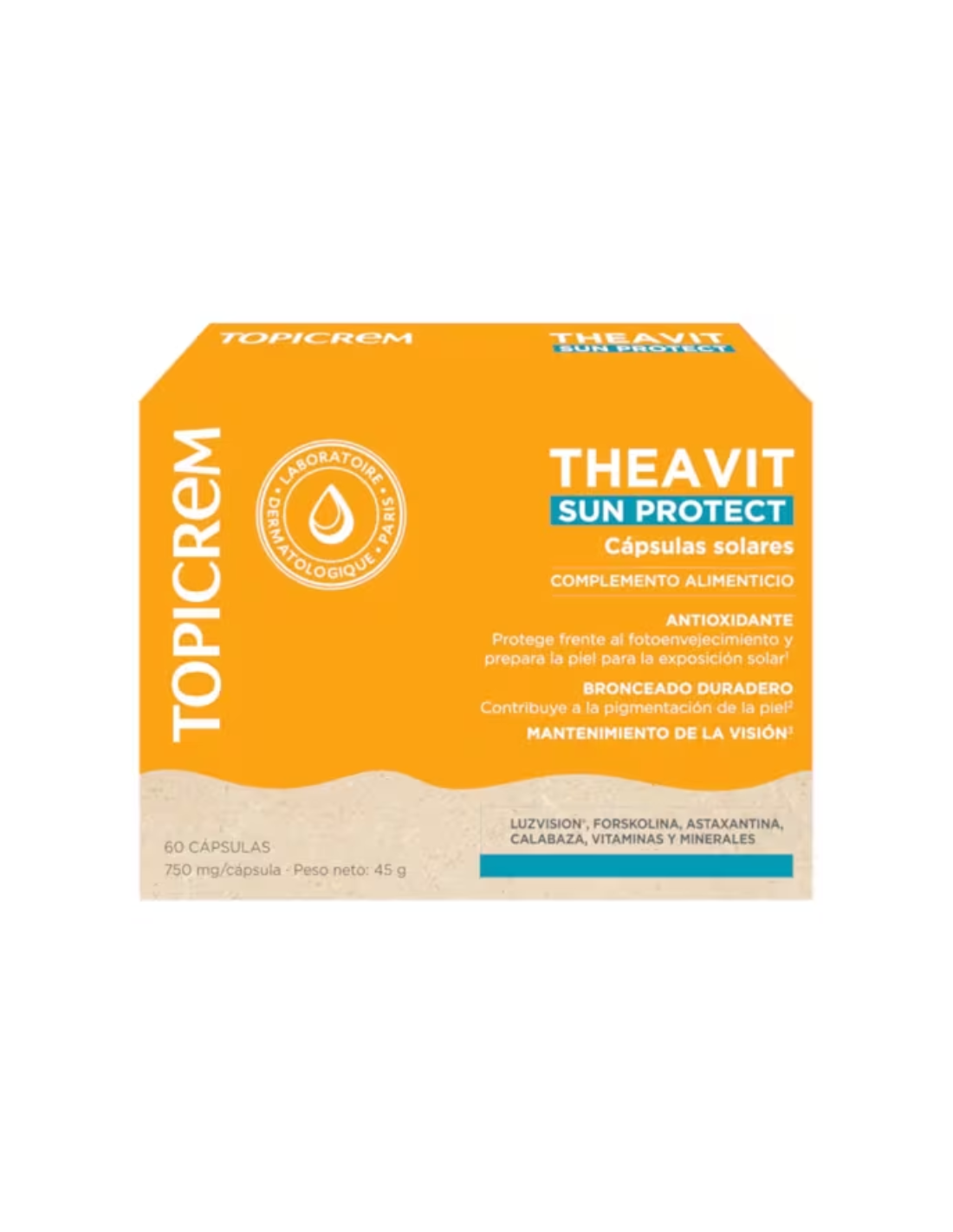 TOPICREM Theavit Sun Protect Cápsulas Solares contiene una combinación de vitaminas (A, C y E), minerales como zinc, manganeso y cobre, carotenoides como luteína, licopeno y astaxantina, así como aminoácidos (L-tirosina, l-histidina y l-glutatión) y ácidos grasos omega-3. Esta fórmula completa aporta acción antioxidante, ayuda a proteger frente al estrés oxidativo y contribuye al mantenimiento de una piel sana frente a la exposición solar.