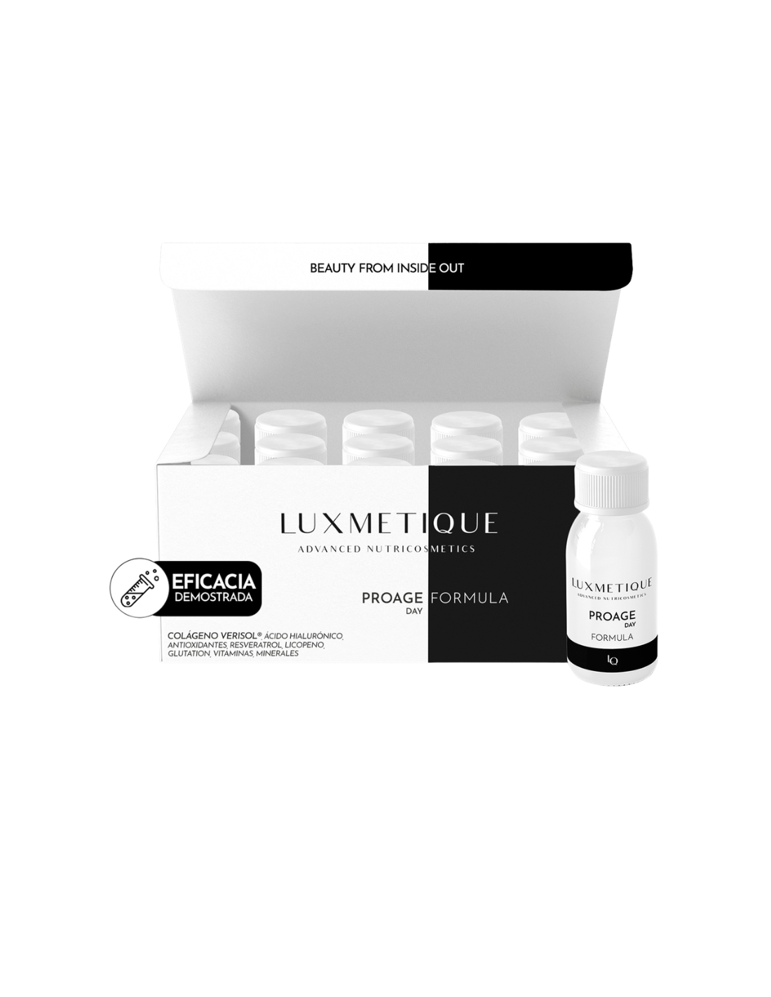 LUXMETIQUE Proage Day Formula - nutricosmético bebible para el cuidado y rejuvenecimiento de la piel, con estudios clínicos de eficacia demostrada desde los primeros 14 días de toma.